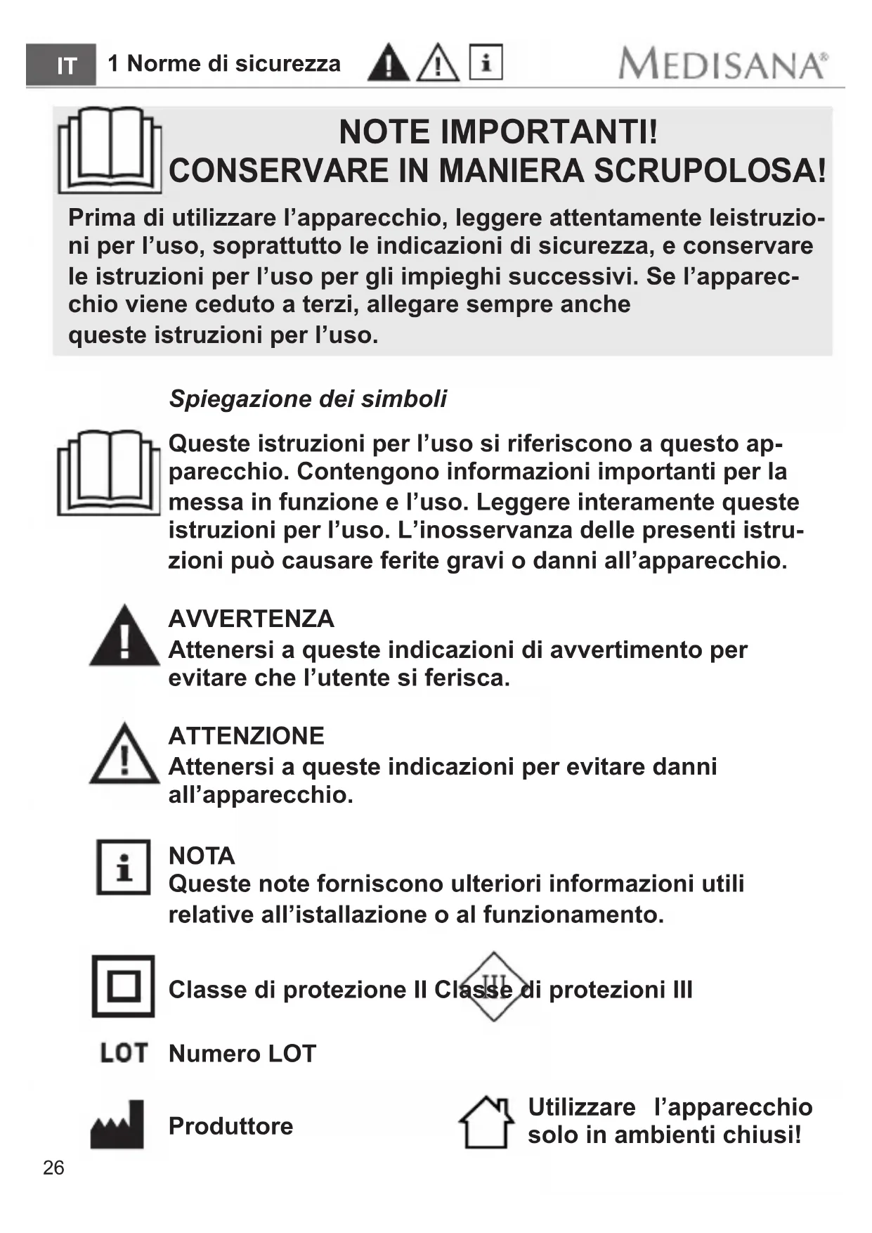 SA! Prima di utilizzare l’apparecchio, leggere attentamente leistruzio- ni per l’uso, soprattutto le indicazioni di sicurezza, e conservare le istruzioni per l’uso per gli impieghi successivi. Se l’apparec- chio viene ceduto a terzi, allegare sempre anche queste istruzioni per l’uso. Spiegazione dei simboli Queste istruzioni per l’uso si riferiscono a questo ap- parecchio. Contengono informazioni importanti per la messa in funzione e l’uso. Leggere interamente queste istruzioni per l’uso. L’inosservanza delle presenti istru- zioni può causare ferite gravi o danni all’apparecchio. AVVERTENZA Attenersi a queste indicazioni di avvertimento per evitare che l’utente si ferisca. ATTENZIONE Attenersi a queste indicazioni per evitare danni all’apparecchio. NOTA Queste note forniscono ulteriori informazioni utili relative all’istallazione o al funzionamento. Numero LOT Produttore 1 Norme di sicurezza