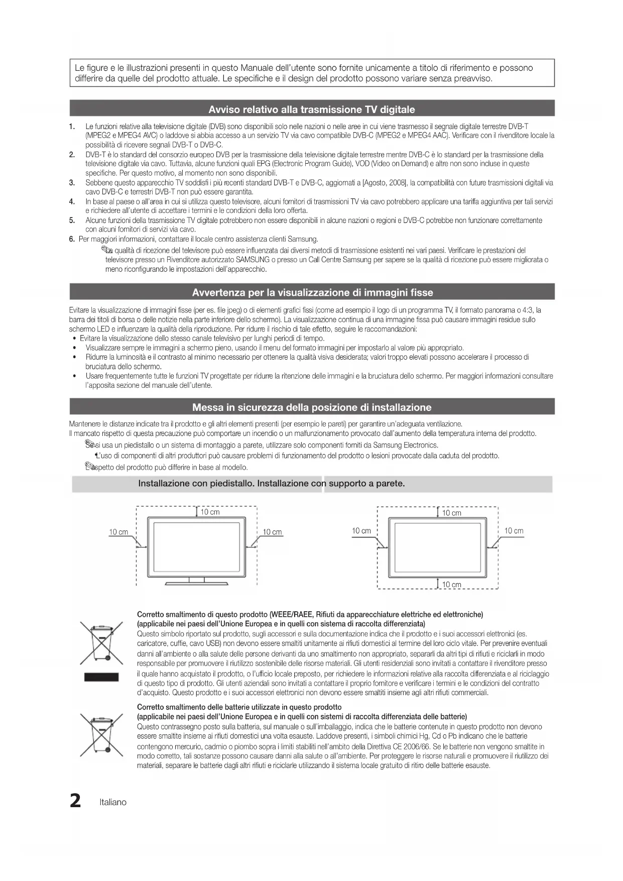 L’aspetto del prodotto può differire in base al modello. Installazione con piedistallo. Installazione con supporto a parete. Corretto smaltimento di questo prodotto (WEEE/RAEE, Rifiuti da apparecchiature elettriche ed elettroniche) (applicabile nei paesi dell’Unione Europea e in quelli con sistema di raccolta differenziata) Questo simbolo riportato sul prodotto, sugli accessori e sulla documentazione indica che il prodotto e i suoi accessori elettronici (es. caricatore, cuffie, cavo USB) non devono essere smaltiti unitamente ai rifiuti domestici al termine del loro ciclo vitale. Per prevenire eventuali danni all’ambiente o alla salute delle persone derivanti da uno smaltimento non appropriato, separarli da altri tipi di rifiuti e riciclarli in modo responsabile per promuovere il riutilizzo sostenibile delle risorse materiali. Gli utenti residenziali sono invitati a contattare il rivenditore presso il quale hanno acquistato il prodotto, o l’ufficio locale preposto, per richiedere le informazioni relative alla raccolta differenziata e al riciclaggio di questo tipo di prodotto. Gli utenti aziendali sono invitati a contattare il proprio fornitore e verificare i termini e le condizioni del contratto d’acquisto. Questo prodotto e i suoi accessori elettronici non devono essere smaltiti insieme agli altri rifiuti commerciali. Corretto smaltimento delle batterie utilizzate in questo prodotto (applicabile nei paesi dell’Unione Europea e in quelli con sistemi di raccolta differenziata delle batterie) Questo contrassegno posto sulla batteria, sul manuale o sull’imballaggio, indica che le batterie contenute in questo prodotto non devono essere smaltite insieme ai rifiuti domestici una volta esauste. Laddove presenti, i simboli chimici Hg, Cd o Pb indicano che le batterie contengono mercurio, cadmio o piombo sopra i limiti stabiliti nell’ambito della Direttiva CE 2006/66. Se le batterie non vengono smaltite in modo corretto, tali sostanze possono causare danni alla salute o all’ambiente. Per proteggere le risorse naturali e promuovere il riutilizzo dei materiali, separare le batterie dagli altri rifiuti e riciclarle utilizzando il sistema locale gratuito di ritiro delle batterie esauste. 10 cm 10 cm 10 cm 10 cm 10 cm 10 cm 10 cm 4_BN68-02849A-00Ita.indd 2 2010-04-01 오후 8:04:093 ITALIANO Italiano Contenuti Per iniziare