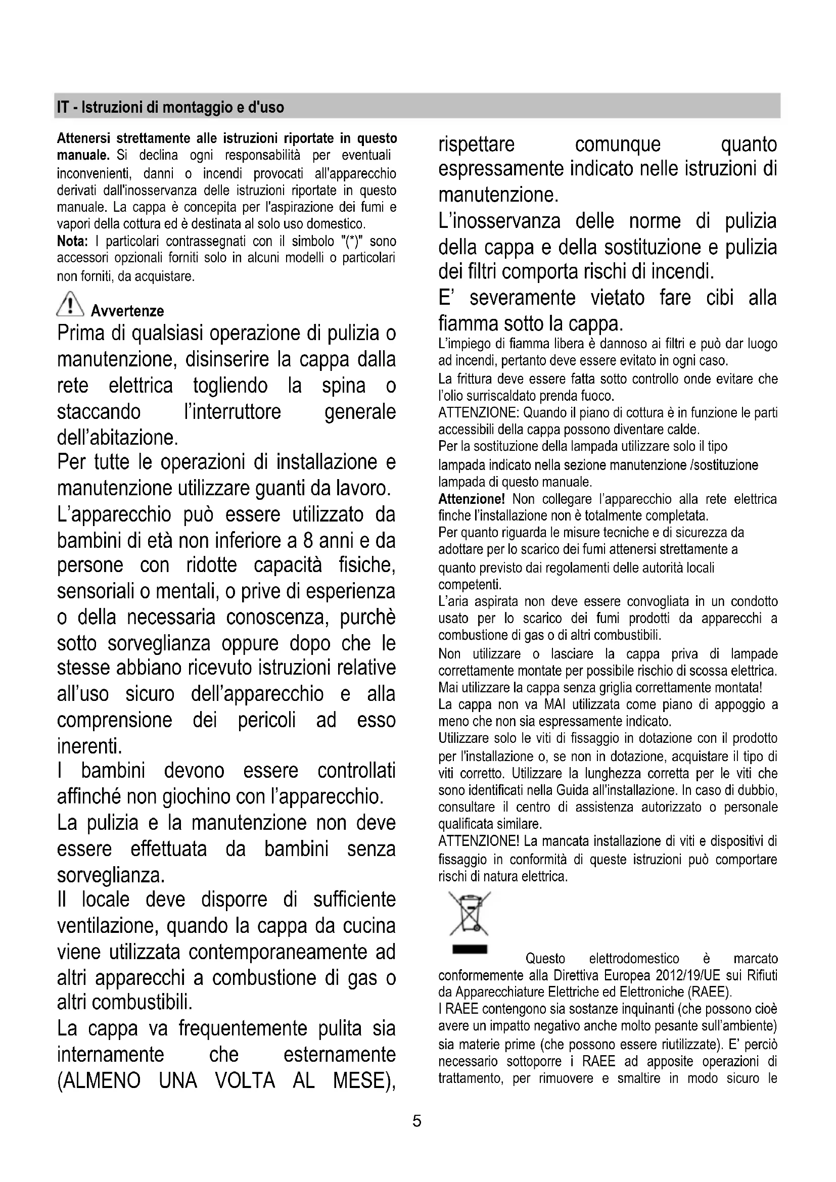 IT Istruzioni di montaggio e d'uso DE Montage- und Gebrauchsanweisung EN Instruction on mounting and use FR Prescriptions de montage et mode d’emploi NL Montagevoorschriften en gebruiksaanwijzingen ES Montaje y modo de empleo PT Instruções para montagem e utilização EL Ο∆ΗΓΙΕΣ ΣΥΝΑΡΜΟΛΟΓΗΣΗΣ ΚΑΙ ΧΡΗΣΗΣ CS Návod na montáž a používání RU Инструкции по монтажу и эксплуатации5 IT - Istruzioni di montaggio e d'uso Attenersi strettamente alle istruzioni riportate in questo manuale. Si declina ogni responsabilità per eventuali inconvenienti, danni o incendi provocati all'apparecchio derivati dall'inosservanza delle istruzioni riportate in questo manuale. La cappa è concepita per l'aspirazione dei fumi e vapori della cottura ed è destinata al solo uso domestico. Nota: I particolari contrassegnati con il simbolo "(*)" sono accessori opzionali forniti solo in alcuni modelli o particolari non forniti, da acquistare. Avvertenze Prima di qualsiasi operazione di pulizia o manutenzione, disinserire la cappa dalla rete elettrica togliendo la spina o staccando l’interruttore generale dell’abitazione. Per tutte le operazioni di installazione e manutenzione utilizzare guanti da lavoro. L’apparecchio può essere utilizzato da bambini di età non inferiore a 8 anni e da persone con ridotte capacità fisiche, sensoriali o mentali, o prive di esperienza o della necessaria conoscenza, purchè sotto sorveglianza oppure dopo che le stesse abbiano ricevuto istruzioni relative all’uso sicuro dell’apparecchio e alla comprensione dei pericoli ad esso inerenti. I bambini devono essere controllati affinché non giochino con l’apparecchio. La pulizia e la manutenzione non deve essere effettuata da bambini senza sorveglianza. Il locale deve disporre di sufficiente ventilazione, quando la cappa da cucina viene utilizzata contemporaneamente ad altri apparecchi a combustione di gas o altri combustibili. La cappa va frequentemente pulita sia internamente che esternamente (ALMENO UNA VOLTA AL MESE), rispettare comunque quanto espressamente indicato nelle istruzioni di manutenzione. L’inosservanza delle norme di pulizia della cappa e della sostituzione e pulizia dei filtri comporta rischi di incendi. E’ severamente vietato fare cibi alla fiamma sotto la cappa. L’impiego di fiamma libera è dannoso ai filtri e può dar luogo ad incendi, pertanto deve essere evitato in ogni caso. La frittura deve essere fatta sotto controllo onde evitare che l’olio surriscaldato prenda fuoco. ATTENZIONE: Quando il piano di cottura è in funzione le parti accessibili della cappa possono diventare calde. Per la sostituzione della lampada utilizzare solo il tipo lampada indicato nella sezione manutenzione /sostituzione lampada di questo manuale. Attenzione! Non collegare l’apparecchio alla rete elettrica finche l’installazione non è totalmente completata. Per quanto riguarda le misure tecniche e di sicurezza da adottare per lo scarico dei fumi attenersi strettamente a quanto previsto dai regolamenti delle autorità locali competenti. L’aria aspirata non deve essere convogliata in un condotto usato per lo scarico dei fumi prodotti da apparecchi a combustione di gas o di altri combustibili. Non utilizzare o lasciare la cappa priva di lampade correttamente montate per possibile rischio di scossa elettrica. Mai utilizzare la cappa senza griglia correttamente montata! La cappa non va MAI utilizzata come piano di appoggio a meno che non sia espressamente indicato. Utilizzare solo le viti di fissaggio in dotazione con il prodotto per l'installazione o, se non in dotazione, acquistare il tipo di viti corretto. Utilizzare la lunghezza corretta per le viti che sono identificati nella Guida all'installazione. In caso di dubbio, consultare il centro di assistenza autorizzato o personale qualificata similare. ATTENZIONE! La mancata installazione di viti e dispositivi di fissaggio in conformità di queste istruzioni può comportare rischi di natura elettrica. Questo elettrodomestico è marcato conformemente alla Direttiva Europea 2012/19/UE sui Rifiuti da Apparecchiature Elettriche ed Elettroniche (RAEE). I RAEE contengono sia sostanze inquinanti (che possono cioè avere un impatto negativo anche molto pesante sull’ambiente) sia materie prime (che possono essere riutilizzate). E’ perciò necessario sottoporre i RAEE ad apposite operazioni di trattamento, per rimuovere e smaltire in modo sicuro le6 sostanze inquinanti ed estrarre e riciclare le materie prime. Ogni cittadino può giocare un ruolo decisivo nell’assicurare che i RAEE non diventino un problema ambientale; basta seguire qualche semplice regola: - i RAEE non vanno mai buttati nella spazzatura indifferenziata; - i RAEE devono essere consegnati ai Centri di Raccolta (chiamati anche isole ecologiche, riciclerie, piattaforme ecologiche …) allestiti dai Comuni o dalle Società di igiene urbana; in molte località viene anche effettuato il servizio di ritiro a domicilio dei RAEE ingombranti. In molte nazioni, quando si acquista una nuova apparecchiatura, si può consegnare il RAEE al negoziante, che è tenuto a ritirarlo gratuitamente (ritiro "uno contro uno") a patto che il nuovo apparecchio sia dello stesso tipo e svolga le stesse funzioni di quello reso. Apparecchiatura progettata, testata e realizzata nel rispetto delle norme sulla: