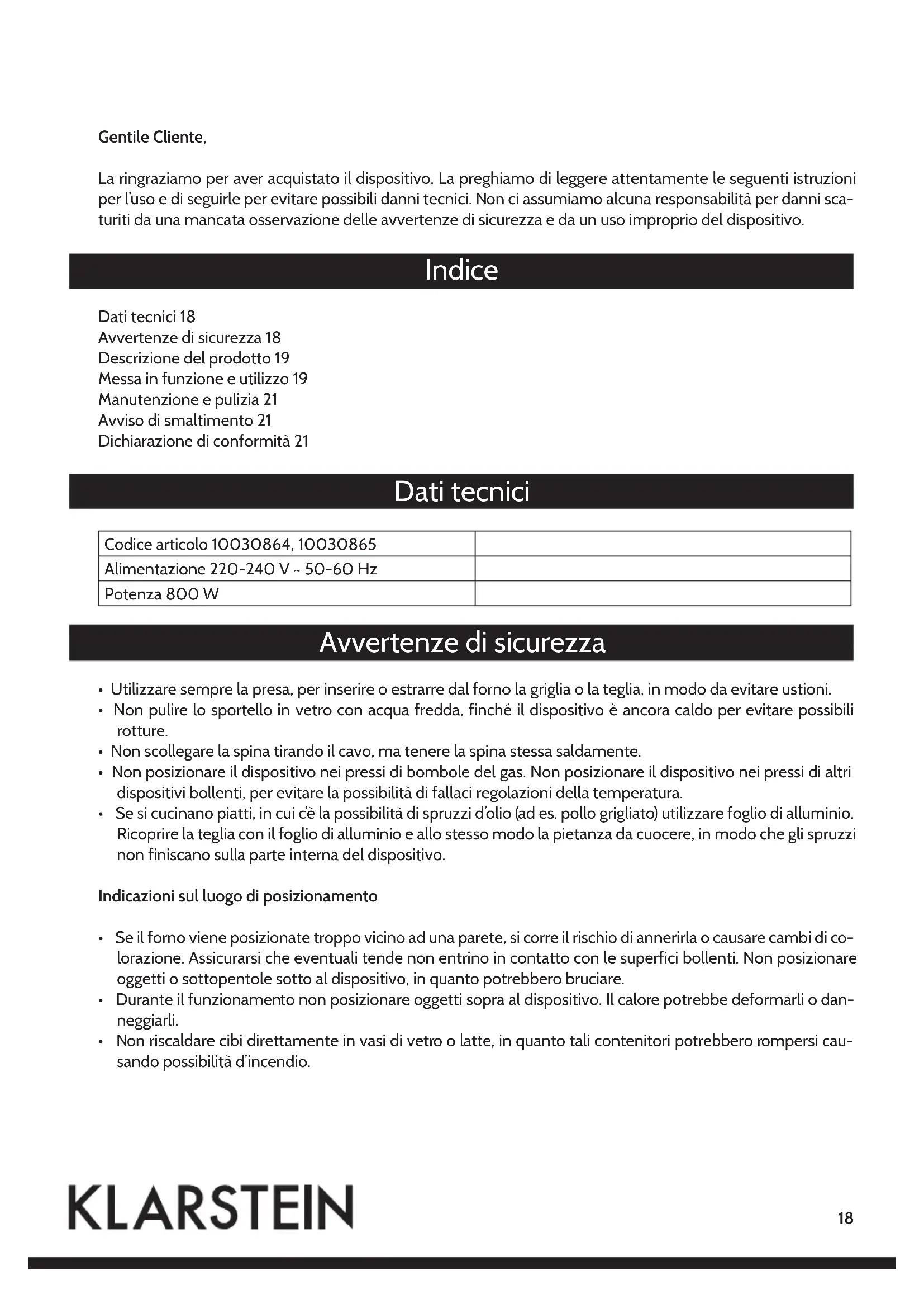 Scarica le istruzioni per il tuo Forno in formato PDF gratuitamente! Trova il tuo manuale Mini 10030764 - Klarstein e riprendi in mano il tuo dispositivo elettronico. In questa pagina sono pubblicati tutti i documenti necessari per l'utilizzo del tuo dispositivo. Mini 10030764 del marchio Klarstein.