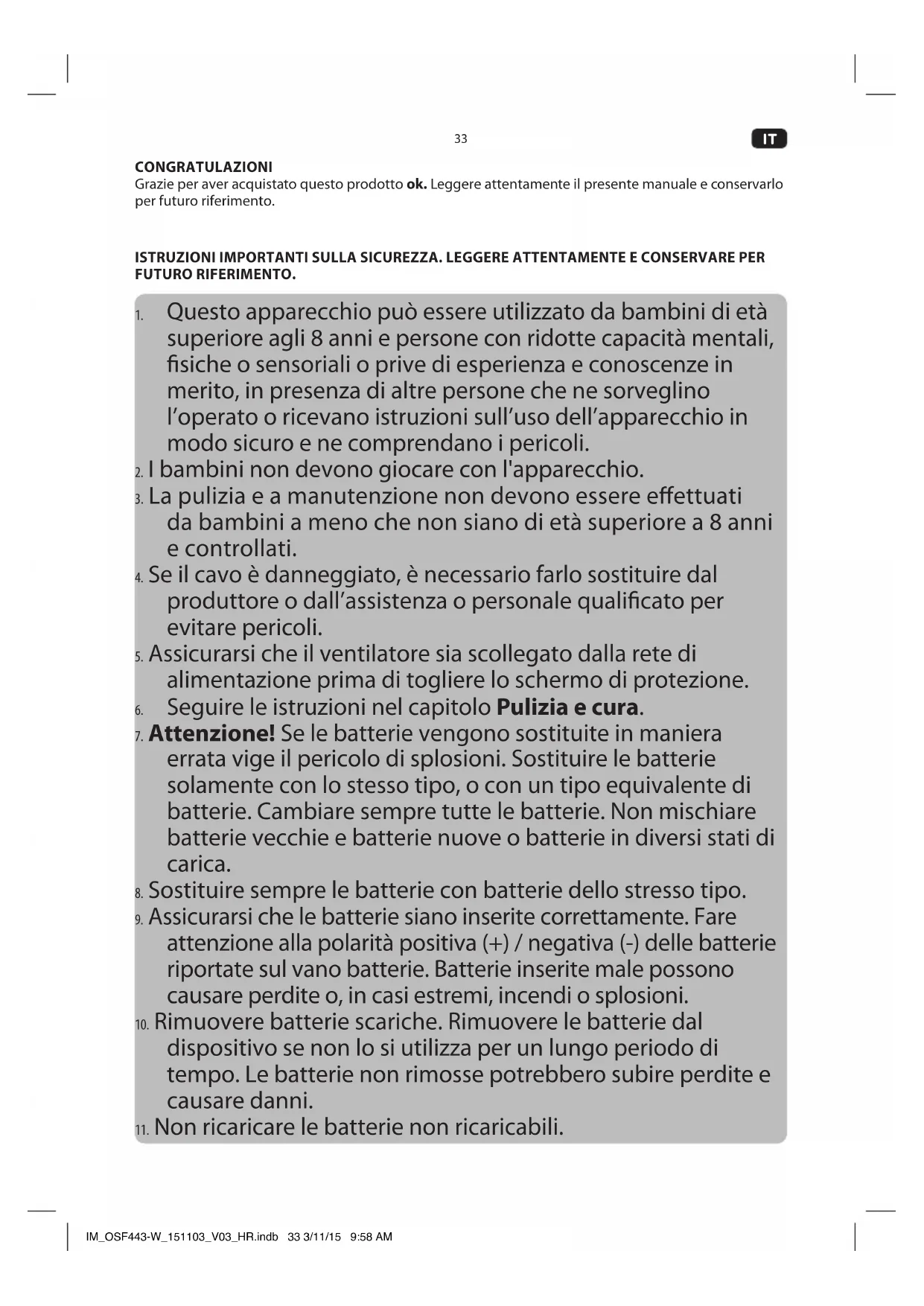 14. Leggere con cura questo manuale prima dell’uso. Contiene importanti informazioni per la sicurezza,