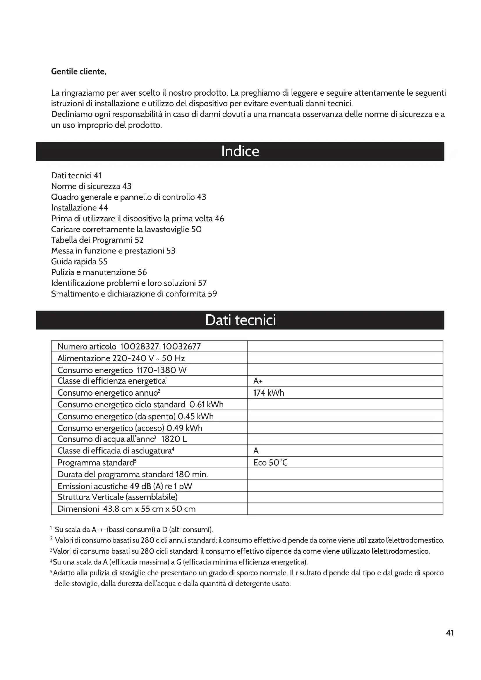 Adatto alla pulizia di stoviglie che presentano un grado di sporco normale. Il risultato dipende dal tipo e dal grado di sporco delle stoviglie, dalla durezza dell’acqua e dalla quantità di detergente usato.42 Norme di sicurezza Leggere le seguenti istruzioni e conservare il presente libretto per ogni eventuale consultazione.