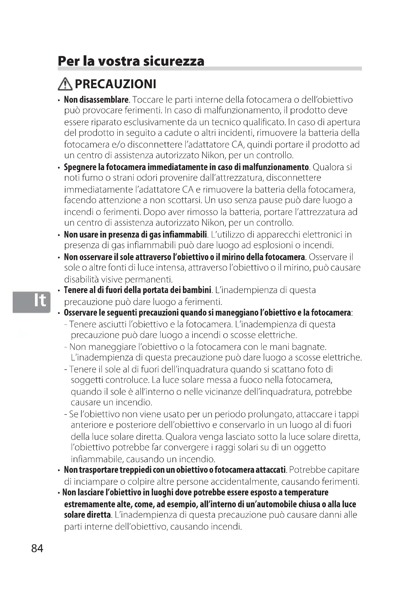 - Non disassemblare. Toccare le parti interne della fotocamera o dell’obiettivo può provocare ferimenti. In caso di malfunzionamento, il prodotto deve essere riparato esclusivamente da un tecnico qualificato. In caso di apertura del prodotto in seguito a cadute o altri incidenti, rimuovere la batteria della fotocamera e/o disconnettere l’adattatore CA, quindi portare il prodotto ad un centro di assistenza autorizzato Nikon, per un controllo.