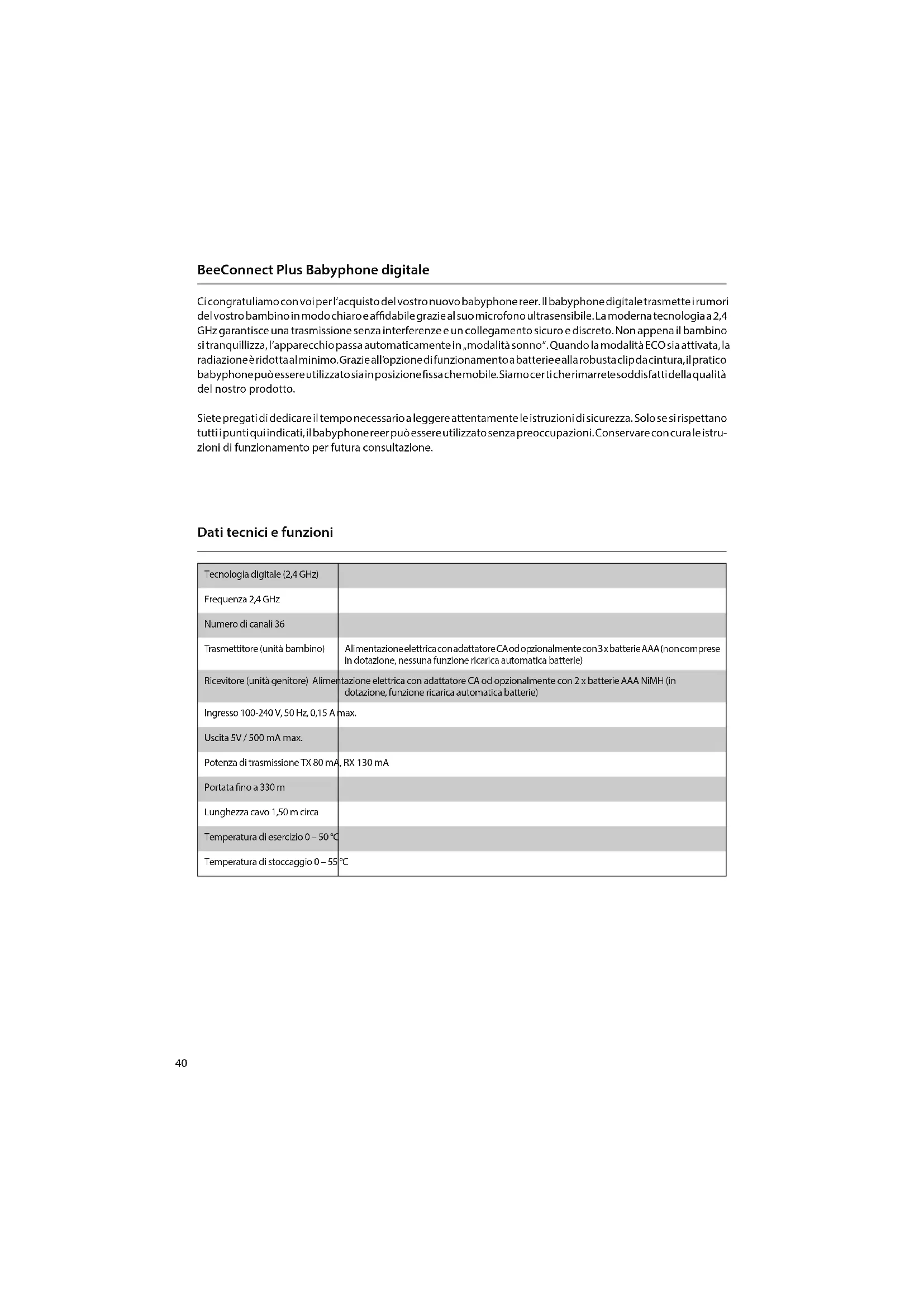 - Parlez dans l’unité bébé ou commutez briè- vement sur la portée «range alarme». FR40 BeeConnect Plus Babyphone digitale Ci congratuliamo con voi per l‘acquisto del vostro nuovo babyphone reer. Il babyphone digitale trasmette i rumori del vostro bambino in modo chiaro e adabile grazie al suo microfono ultrasensibile. La moderna tecnologia a 2,4 GHz garantisce una trasmissione senza interferenze e un collegamento sicuro e discreto. Non appena il bambino si tranquillizza, l‘apparecchio passa automaticamente in „modalità sonno“. Quando la modalità ECO sia attivata, la radiazione è ridotta al minimo. Grazie all‘opzione di funzionamento a batterie e alla robusta clip da cintura, il pratico babyphone può essere utilizzato sia in posizione ssa che mobile. Siamo cer ti che rimarrete soddisfatti della qualità del nostro prodotto. Siete pregati di dedicare il tempo necessario a leggere attentamente le istruzioni di sicurezza. Solo se si rispettano tutti i punti qui indicati, il babyphone reer può essere utilizzato senza preoccupazioni. Conservare con cura le istru- zioni di funzionamento per futura consultazione. Tecnologia digitale (2,4 GHz) Frequenza 2,4 GHz Numero di canali 36 Trasmettitore (unità bambino) Alimentazione elettrica con adattatore CA od opzionalmente con 3 x batterie AAA (non comprese in dotazione, nessuna funzione ricarica automatica batterie) Ricevitore (unità genitore) Alimentazione elettrica con adattatore CA od opzionalmente con 2 x batterie AAA NiMH (in dotazione, funzione ricarica automatica batterie) Ingresso 100-240 V, 50 Hz, 0,15 A max. Uscita 5V / 500 mA max. Potenza di trasmissione TX 80 mA, RX 130 mA Portata no a 330 m Lunghezza cavo 1,50 m circa Temperatura di esercizio 0 – 50 °C Temperatura di stoccaggio 0 – 55 °C Dati tecnici e funzioni41
