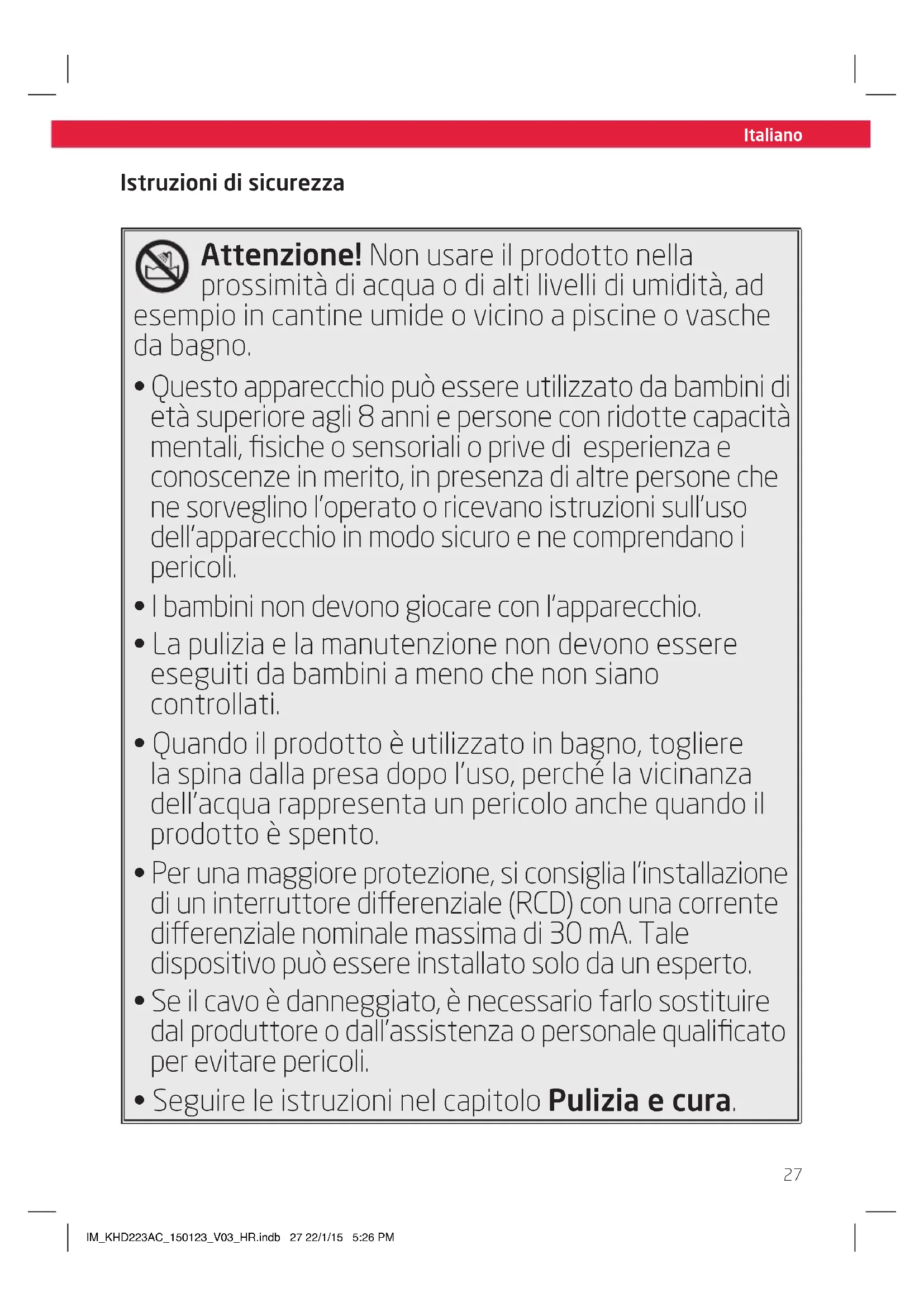 - Questo apparecchio può essere utilizzato da bambini di età superioreagli 8 anni e persone con ridotte capacità mentali, fisiche o sensoriali o prive di esperienza e conoscenze in merito, in presenza di altre persone che ne sorveglino l'operato o ricevano istruzioni sull'uso dell'apparecchio in modo sicuro e ne comprehanno i pericoli.