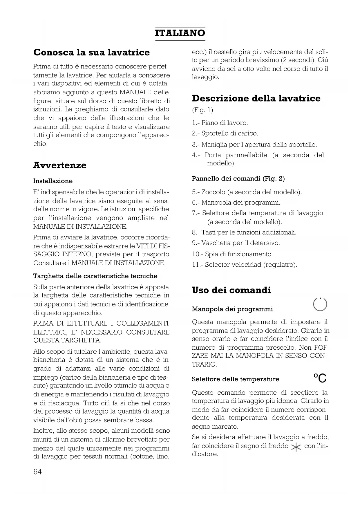 QUESTA TARGHETTA. Allo scopo di tutelare l’ambiente, questa lava- biancheria é dotata di un sistema che é in grado di adattarsi alle varie condizioni di impiego (carico della biancheria e tipo di tes- suto) garantendo un livello ottimale di acqua e di energia e mantenendo i risultati di lavaggio e di risciacqua. Tutto ciú fa si che nel corso del processo di lavaggio la quantitá di acqua visibile dall’obiú possa sembrare bassa. Inoltre, allo stesso scopo, alcuni modelli sono muniti di un sistema di allarme brevettato per mezzo del quale unicamente nei programmi di lavaggio per tessuti normali (cotone, lino, ecc.) il cestello gira piu velocemente del soli- to per un periodo brevissimo (2 secondi). Ciú avviene da sei a otto volte nel corso di tutto il lavaggio. Descrizione della lavatrice (Fig. 1) 1.- Piano di lavoro. 2.- Sportello di carico. 3.- Maniglia per l’apertura dello sportello. 4.- Porta parnnellabile (a seconda del modello). Pannello dei comandi (Fig. 2) 5.- Zoccolo (a seconda del modello). 6.- Manopola dei programmi. 7.- Selettore della temperatura di lavaggio (a seconda del modello). 8.- Tasti per le funzioni addizionali. 9.- Vaschetta per il detersivo. 10.- Spia di funzionamento. 11.- Selector velocidad (regulatro). Uso dei comandi Manopola dei programmi Questa manopola permette di impostare il programma di lavaggio desiderato. Girarlo in senso orario e far coincidere l’indice con il numero di programma prescelto. Non FOF- ZARE MAI LA MANOPOLA IN SENSO CON- TRARIO. Selettore delle temperature Questo comando permette di scegliere la temperatura di lavaggio più idonea. Girarlo in modo da far coincidere il numero corrispon- dente alla temperatura desiderata con il segno marcato. Se si desidera effettuare il lavaggio a freddo, far coincidere il segno di freddo con l’in- dicatore.