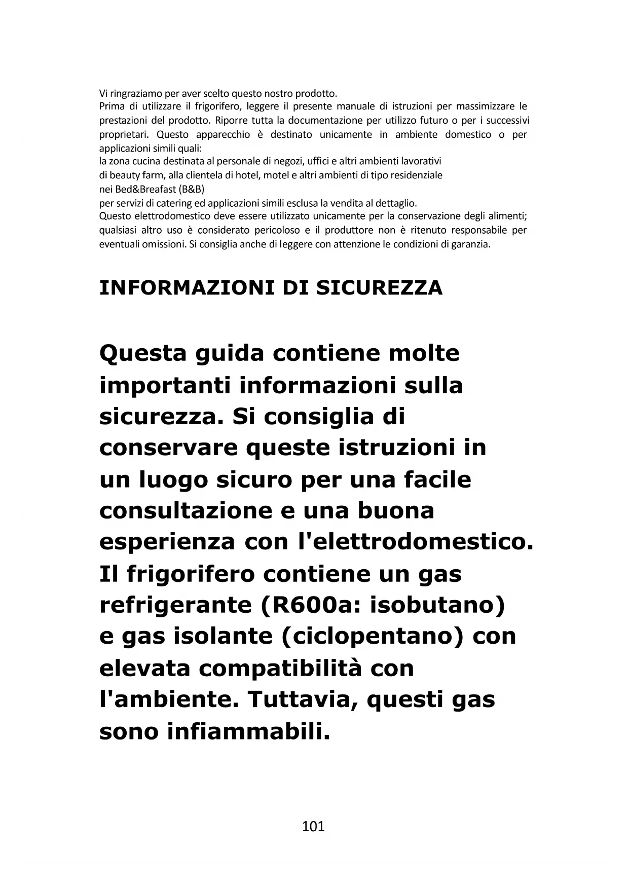 Questa guida contiene molte importanti informazioni sulla sicurezza. Si consiglia di conservare queste istruzioni in un luogo sicuro per una facile consultazione e una buona esperienza con l'elettrodomestico. Il frigorifero contiene un gas refrigerante (R600a: isobutano) e gas isolante (ciclopentano) con elevata compatibilità con l'ambiente. Tuttavia, questi gas sono infiammabili.102
