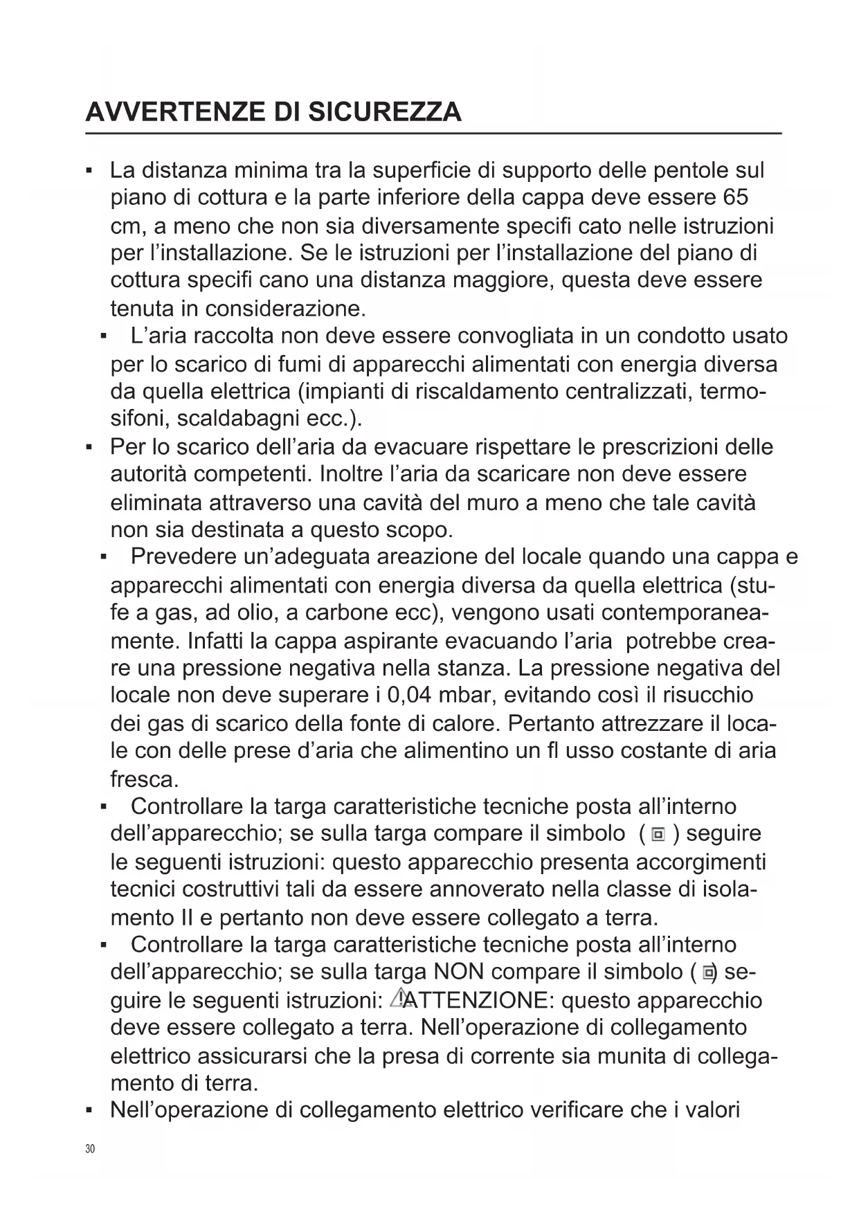 - Prevedere un’adeguata areazione del locale quando una cappa e apparecchi alimentati con energia diversa da quella elettrica (stu- fe a gas, ad olio, a carbone ecc), vengono usati contemporanea- mente. Infatti la cappa aspirante evacuando l’aria potrebbe crea- re una pressione negativa nella stanza. La pressione negativa del locale non deve superare i 0,04 mbar, evitando così il risucchio dei gas di scarico della fonte di calore. Pertanto attrezzare il loca- le con delle prese d’aria che alimentino un fl usso costante di aria fresca.