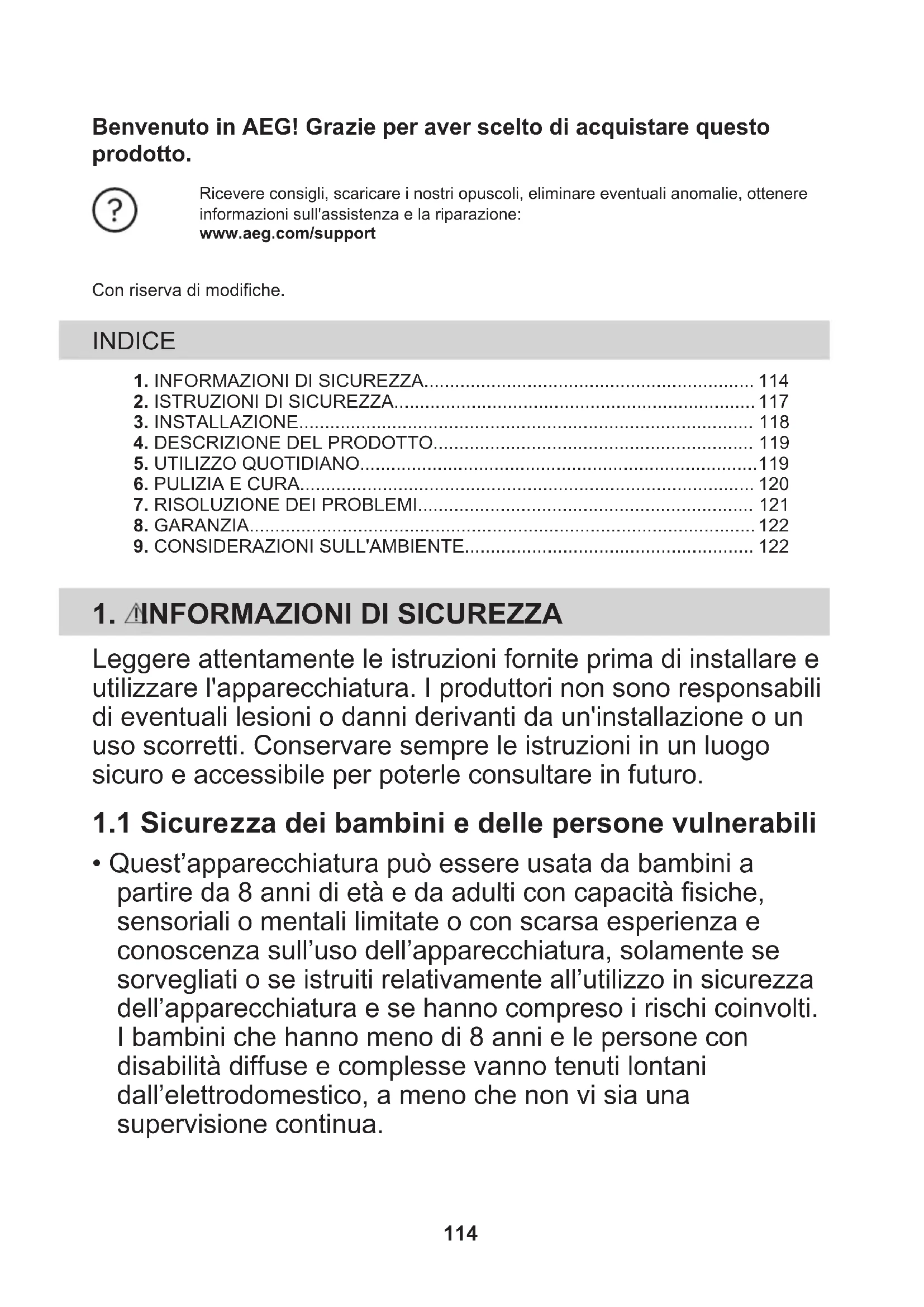 Riciclare i materiali con il simbolo . Buttare l'imballaggio negli appositi contenitori per il riciclaggio. Aiutare a proteggere l’ambiente e la salute umana e a riciclare rifiuti derivanti da apparecchiature elettriche ed elettroniche. Non smaltire le apparecchiature che riportano il simbolo insieme ai normali rifiuti domestici. Portare il prodotto al punto di riciclaggio più vicino o contattare il comune di residenza. Per la Svizzera: Dove portare gli apparecchi fuori uso? In qualsiasi negozio che vende apparecchi nuovi oppure si restituiscono ai centri di raccolta ufficiali della SENS oppure ai riciclatori ufficiali della SENS. La lista dei centri di raccolta ufficiali della SENS è visibile nel sito www.erecycling.ch 122AEG компаниясына қош келдіңіз! Құрылғымызды таңдағаныңызға рақмет. Пайдалану туралы ақпаратты, кітапшаларды, ақаулықты жою құралы, қызметкөрсету және жөндеу туралы ақпаратты мына жерден алыңыз:www.aeg.com/supportӨндіруші ескертусіз өзгеріс енгізу құқығына ие.