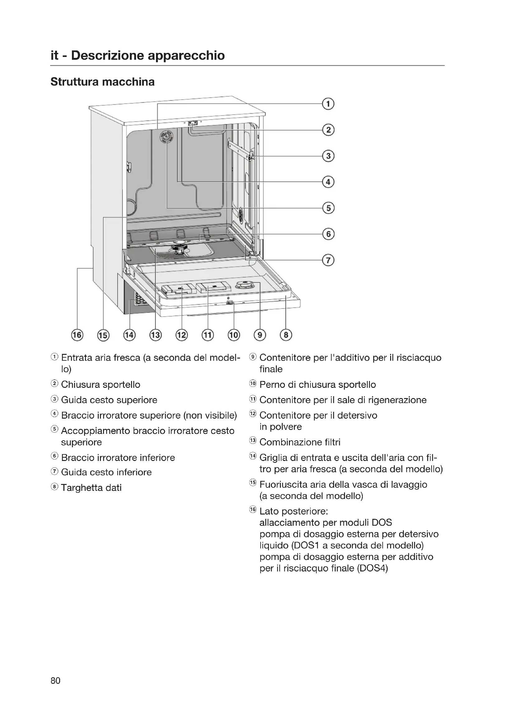 Lato posteriore: allacciamento per moduli DOS pompa di dosaggio esterna per detersivo liquido (DOS1 a seconda del modello) pompa di dosaggio esterna per additivo per il risciacquo finale (DOS4)it - Descrizione apparecchio
