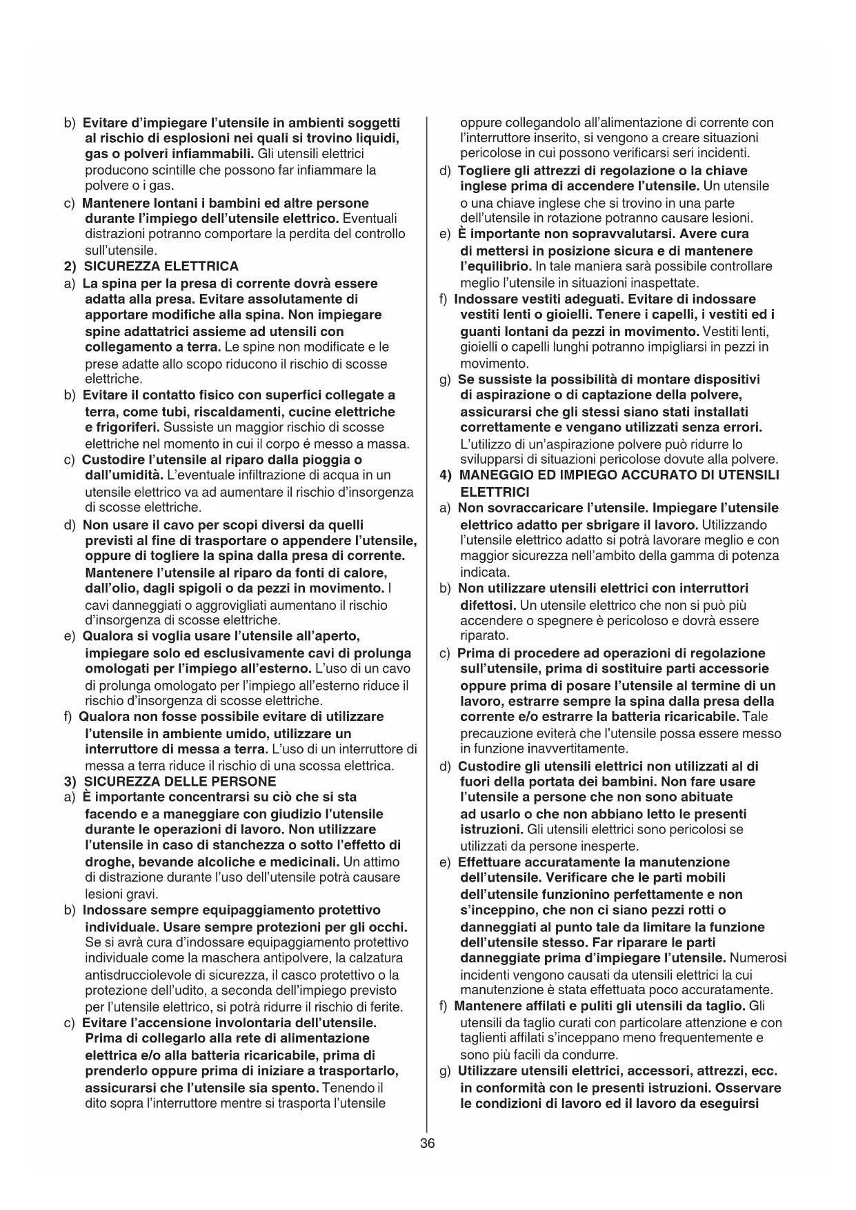 ELETTRICI a) Non sovraccaricare l’utensile. Impiegare l’utensile elettrico adatto per sbrigare il lavoro. Utilizzando l’utensile elettrico adatto si potrà lavorare meglio e con maggior sicurezza nell’ambito della gamma di potenza indicata. b) Non utilizzare utensili elettrici con interruttori difettosi. Un utensile elettrico che non si può più accendere o spegnere è pericoloso e dovrà essere riparato. c) Prima di procedere ad operazioni di regolazione sull’utensile, prima di sostituire parti accessorie oppure prima di posare l’utensile al termine di un lavoro, estrarre sempre la spina dalla presa della corrente e/o estrarre la batteria ricaricabile. Tale precauzione eviterà che l’utensile possa essere messo in funzione inavvertitamente. d) Custodire gli utensili elettrici non utilizzati al di fuori della portata dei bambini. Non fare usare l’utensile a persone che non sono abituate ad usarlo o che non abbiano letto le presenti istruzioni. Gli utensili elettrici sono pericolosi se utilizzati da persone inesperte. e) Eettuare accuratamente la manutenzione dell’utensile. Vericare che le parti mobili dell’utensile funzionino perfettamente e non s’inceppino, che non ci siano pezzi rotti o danneggiati al punto tale da limitare la funzione dell’utensile stesso. Far riparare le parti danneggiate prima d’impiegare l’utensile. Numerosi incidenti vengono causati da utensili elettrici la cui manutenzione è stata eettuata poco accuratamente. f) Mantenere alati e puliti gli utensili da taglio. Gli utensili da taglio curati con particolare attenzione e con taglienti alati s’inceppano meno frequentemente e sono più facili da condurre. g) Utilizzare utensili elettrici, accessori, attrezzi, ecc. in conformità con le presenti istruzioni. Osservare le condizioni di lavoro ed il lavoro da eseguirsi37 durante l’impiego. L’impiego di utensili elettrici per usi diversi da quelli consentiti potrà dar luogo a situazioni di pericolo.