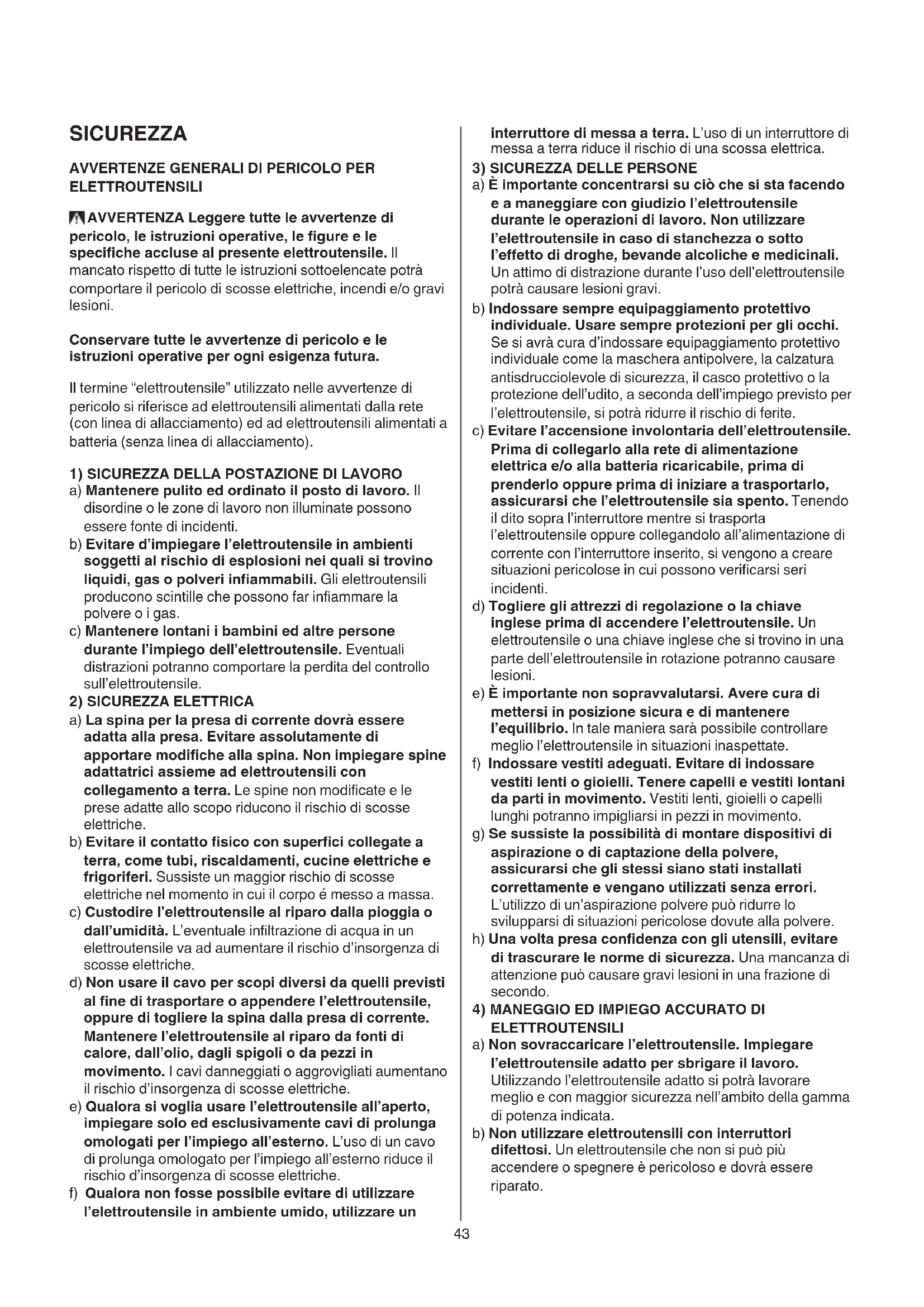ELETTROUTENSILI a) Non sovraccaricare l’elettroutensile. Impiegare l’elettroutensile adatto per sbrigare il lavoro. Utilizzando l’elettroutensile adatto si potrà lavorare meglio e con maggior sicurezza nell’ambito della gamma di potenza indicata. b) Non utilizzare elettroutensili con interruttori difettosi. Un elettroutensile che non si può più accendere o spegnere è pericoloso e dovrà essere riparato.44 c) Prima di procedere ad operazioni di regolazione sull’elettroutensile, prima di sostituire parti accessorie oppure prima di posare l’elettroutensile al termine di un lavoro, estrarre sempre la spina dalla presa della corrente e/o estrarre la batteria ricaricabile, se rimovibile. Tale precauzione eviterà che l’elettroutensile possa essere messo in funzione inavvertitamente. d) Custodire gli elettroutensili non utilizzati al di fuori della portata dei bambini. Non fare usare l’elettroutensile a persone che non sono abituate ad usarlo o che non abbiano letto le presenti istruzioni. Gli elettroutensili sono pericolosi se utilizzati da persone inesperte. e) Eseguire la manutenzione degli elettroutensili e degli accessori. Verificare che le parti mobili dell’elettroutensile funzionino perfettamente e non s’inceppino, che non ci siano pezzi rotti o danneggiati al punto tale da limitare la funzione dell’elettroutensile stesso. Far riparare le parti danneggiate prima d’impiegare l’elettroutensile. Numerosi incidenti vengono causati da elettroutensili la cui manutenzione è stata eettuata poco accuratamente. f) Mantenere affilati e puliti gli elettroutensili da taglio. Gli elettroutensili da taglio curati con particolare attenzione e con taglienti alati s’inceppano meno frequentemente e sono più facili da condurre. g) Utilizzare elettroutensili, accessori, attrezzi, ecc. in conformità con le presenti istruzioni. Osservare le condizioni di lavoro ed il lavoro da eseguirsi durante l’impiego. L’impiego di elettroutensili per usi diversi da quelli consentiti potrà dar luogo a situazioni di pericolo. h) Mantenere impugnature e superfici di presa asciutte, pulite e prive di olio e grasso. Impugnature e superci di presa scivolose non consentono di manipolare e controllare l’utensile in caso di situazioni inaspettate.