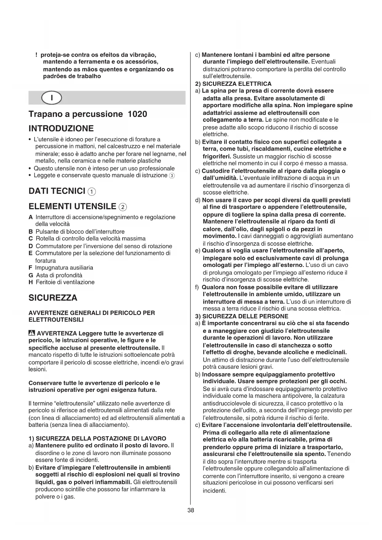 - Leggete e conservate questo manuale di istruzione 3 DATI TECNICI 1 ELEMENTI UTENSILE 2 A Interruttore di accensione/spegnimento e regolazione della velocità B Pulsante di blocco dell’interruttore C Rotella di controllo della velocità massima D Commutatore per l’inversione del senso di rotazione E Commutatore per la selezione del funzionamento di foratura F Impugnatura ausiliaria G Asta di profondità H Feritoie di ventilazione SICUREZZA