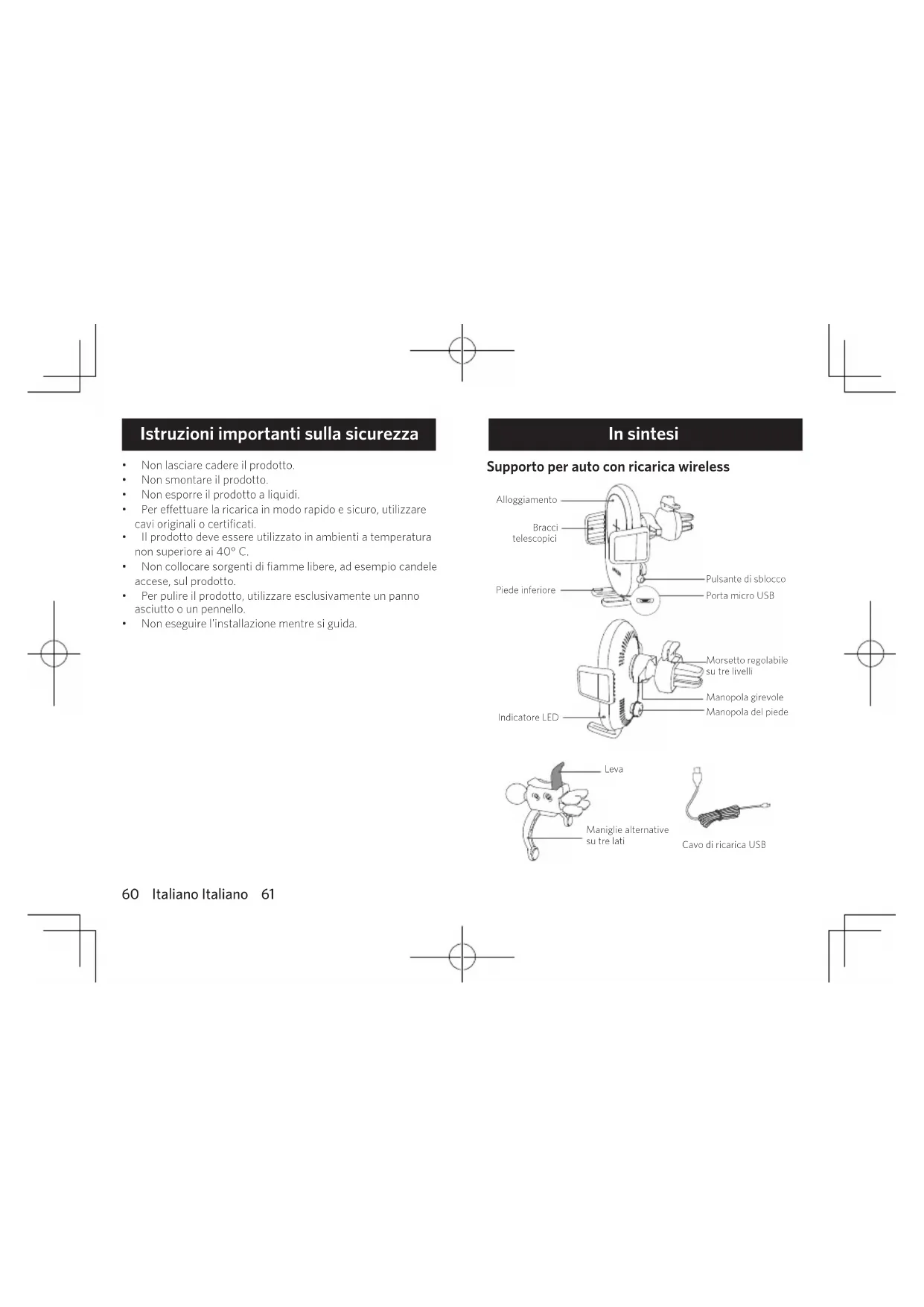 - Non eseguire l'installazione mentre si guida. In sintesi Supporto per auto con ricarica wireless Bracci telescopici Piede inferiore Indicatore LED Pulsante di sblocco Porta micro USB Manopola girevole Manopola del piede Morsetto regolabile su tre livelli Alloggiamento Cavo di ricarica USB Maniglie alternative su tre lati Leva62 Italiano Italiano 63 LED di stato L'indicatore LED visualizza lo stato del caricabatterie per auto. Stato Indicatore LED Collegato a una fonte di alimentazione Blu fisso per tre secondi, poi si spegne Dispositivo mobile in ricarica / Ricarica completata Blu fisso - Rilevato metallo o altri oggetti estranei - Utilizzo di cavi o caricabatterie per auto non compatibili Blu lampeggiante Rilevato problema di surriscaldamento Rosso lampeggiante Compatibilità Prima di utilizzare il prodotto, assicurarsi che lo smartphone sia compatibile con la tecnologia di ricarica wireless Qi. Smartphone Caricabatterie per auto Potenza in uscita Telefoni compatibili con lo standard di ricarica Qi + 5V 2A = 5W iPhone XS Max, iPhone XS, iPhone XR, iPhone X, iPhone 8 Plus, iPhone 8, ecc.