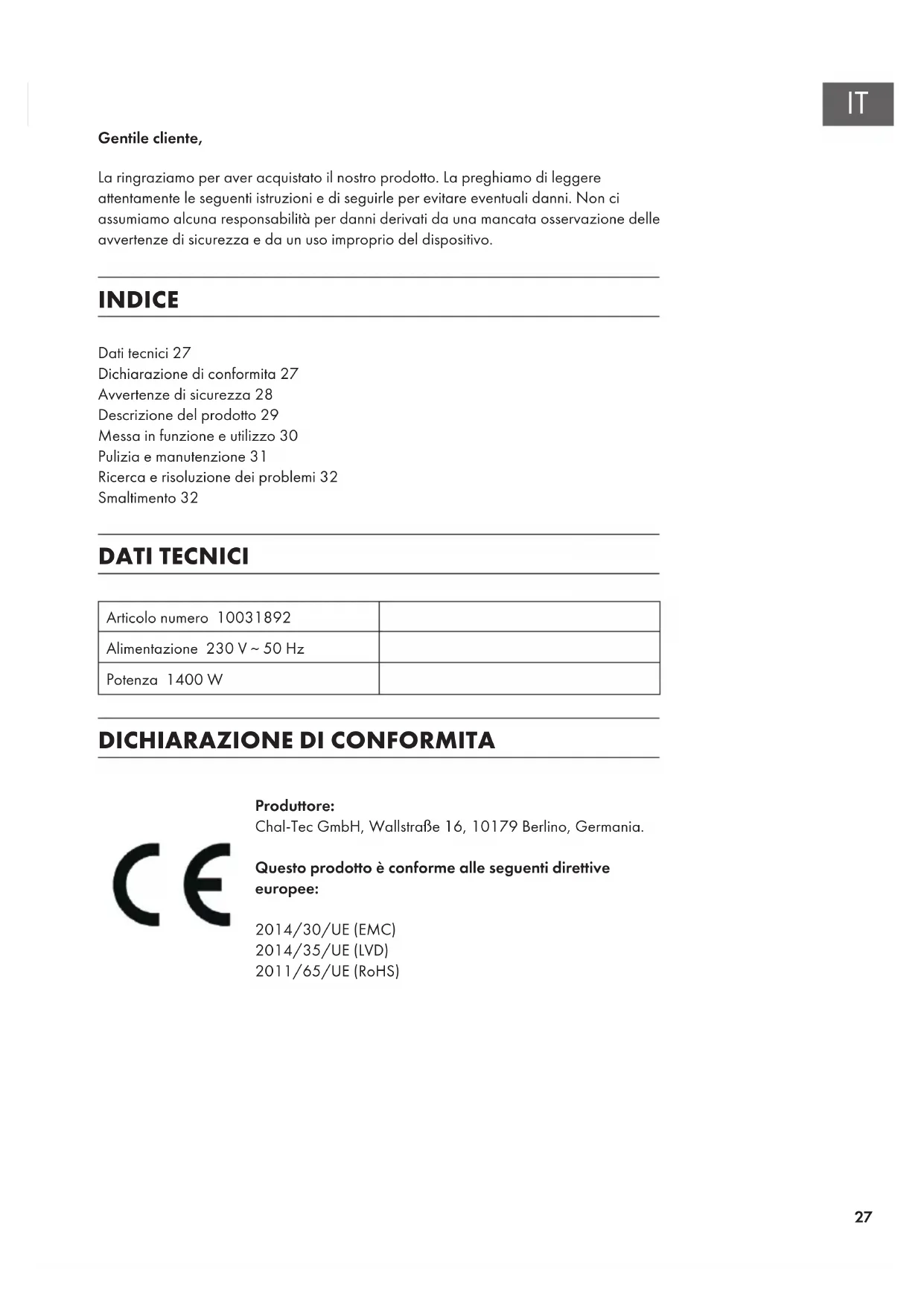 Gentile cliente, La ringraziamo per aver acquistato il nostro prodotto. La preghiamo di leggere attentamente le seguenti istruzioni e di seguirle per evitare eventuali danni. Non ci assumiamo alcuna responsabilità per danni derivati da una mancata osservazione delle avvertenze di sicurezza e da un uso improprio del dispositivo. INDICE Dati tecnici27 Dichiarazione di conformita27 Avvertenze di sicurezza28 Descrizione del prodotto29 Messa in funzione e utilizzo30 Pulizia e manutenzione31 Ricerca e risoluzione dei problemi32 Smaltimento32 DATI TECNICI Articolo numero 10031892 Alimentazione 230 V ~ 50 Hz Potenza 1400 W