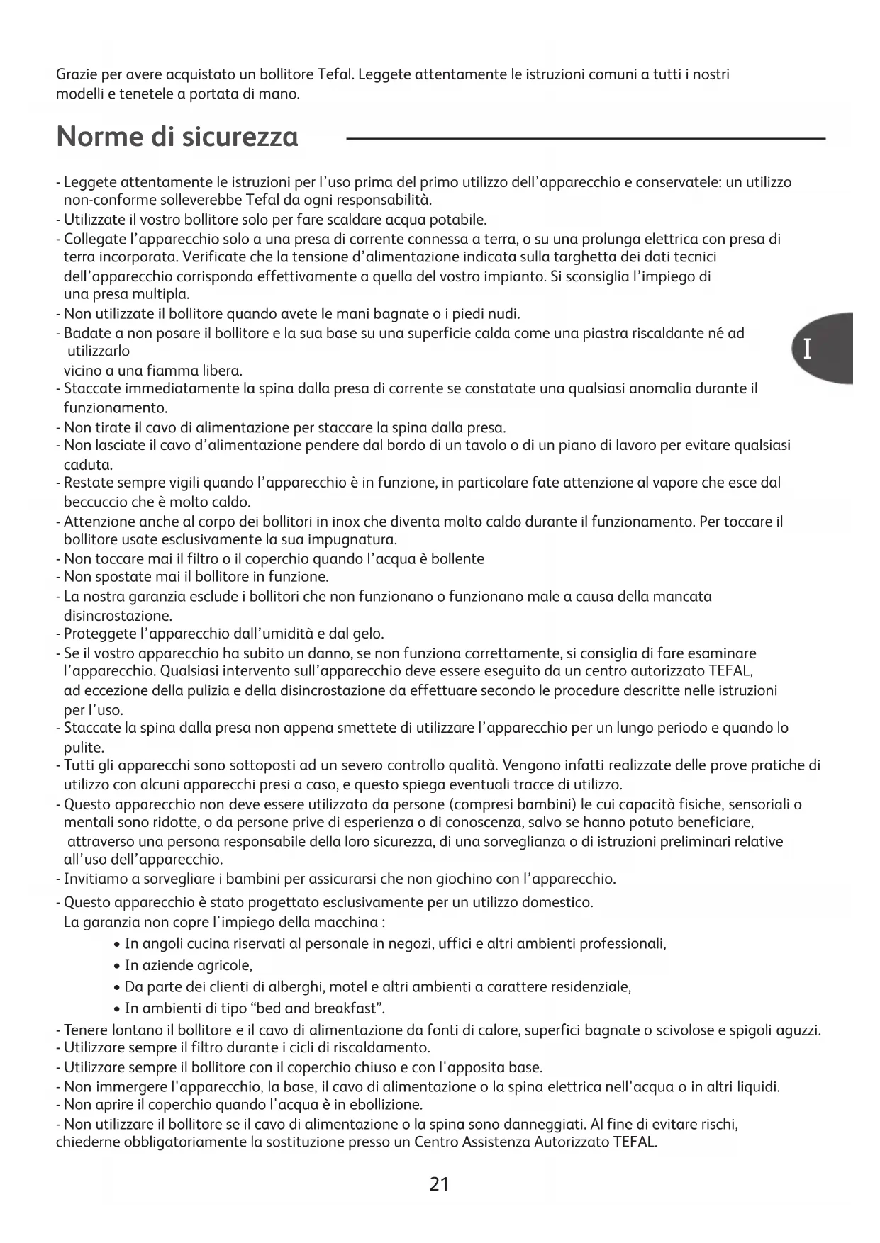 Norme di sicurezza Grazie per avere acquistato un bollitore Tefal. Leggete attentamente le istruzioni comuni a tutti i nostri modelli e tenetele a portata di mano. I22 - La garanzia copre esclusivamente i difetti di fabbricazione e l'utilizzo domestico. Qualsiasi rottura o deterioramento dovuti al mancato rispetto delle istruzioni per l'uso non rientrano nella garanzia. - Non utilizzare pagliette abrasive per la pulizia. - Per rimuovere il filtro anticalcare, sollevare il bollitore dalla base e lasciare raffreddare l'apparecchio. Non rimuovere mai il filtro quando l'apparecchio è colmo di acqua calda. - Non utilizzare altri metodi di decalcificazione se non quello raccomandato. - Non riempire il bollitore oltre il livello massimo d'acqua indicato, né al di sotto del livello minimo. Se il bollitore è troppo pieno, potrebbe fuoriuscire dell'acqua.