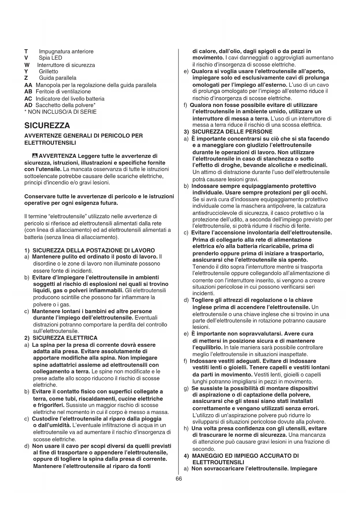ELETTROUTENSILI a) Non sovraccaricare l’elettroutensile. Impiegare T Impugnatura anteriore V Spia LED W Interruttore di sicurezza Y Grilletto Z Guida parallela AA Manopola per la regolazione della guida parallela AB Feritoie di ventilazione AC Indicatore del livello batteria AD Sacchetto della polvere*
