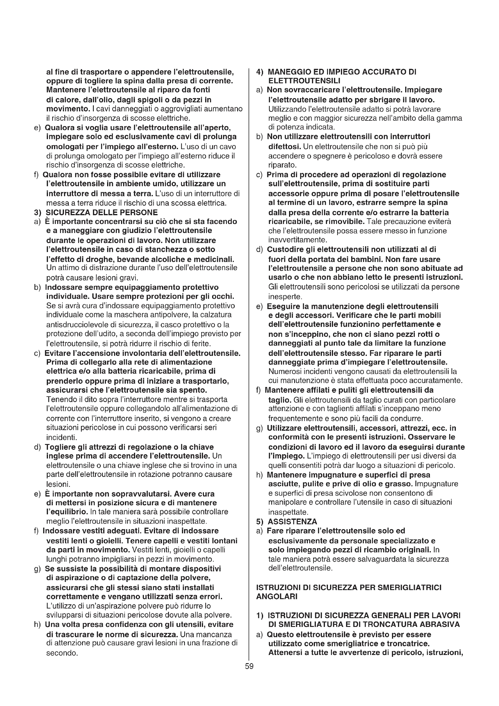 a) Questo elettroutensile è previsto per essere utilizzato come smerigliatrice e troncatrice. Attenersi a tutte le avvertenze di pericolo, istruzioni, al ne di trasportare o appendere l’elettroutensile, oppure di togliere la spina dalla presa di corrente. Mantenere l’elettroutensile al riparo da fonti di calore, dall’olio, dagli spigoli o da pezzi in movimento. I cavi danneggiati o aggrovigliati aumentano il rischio d’insorgenza di scosse elettriche. e) Qualora si voglia usare l’elettroutensile all’aperto, impiegare solo ed esclusivamente cavi di prolunga omologati per l’impiego all’esterno. L’uso di un cavo di prolunga omologato per l’impiego all’esterno riduce il rischio d’insorgenza di scosse elettriche. f) Qualora non fosse possibile evitare di utilizzare l’elettroutensile in ambiente umido, utilizzare un interruttore di messa a terra. L’uso di un interruttore di messa a terra riduce il rischio di una scossa elettrica.