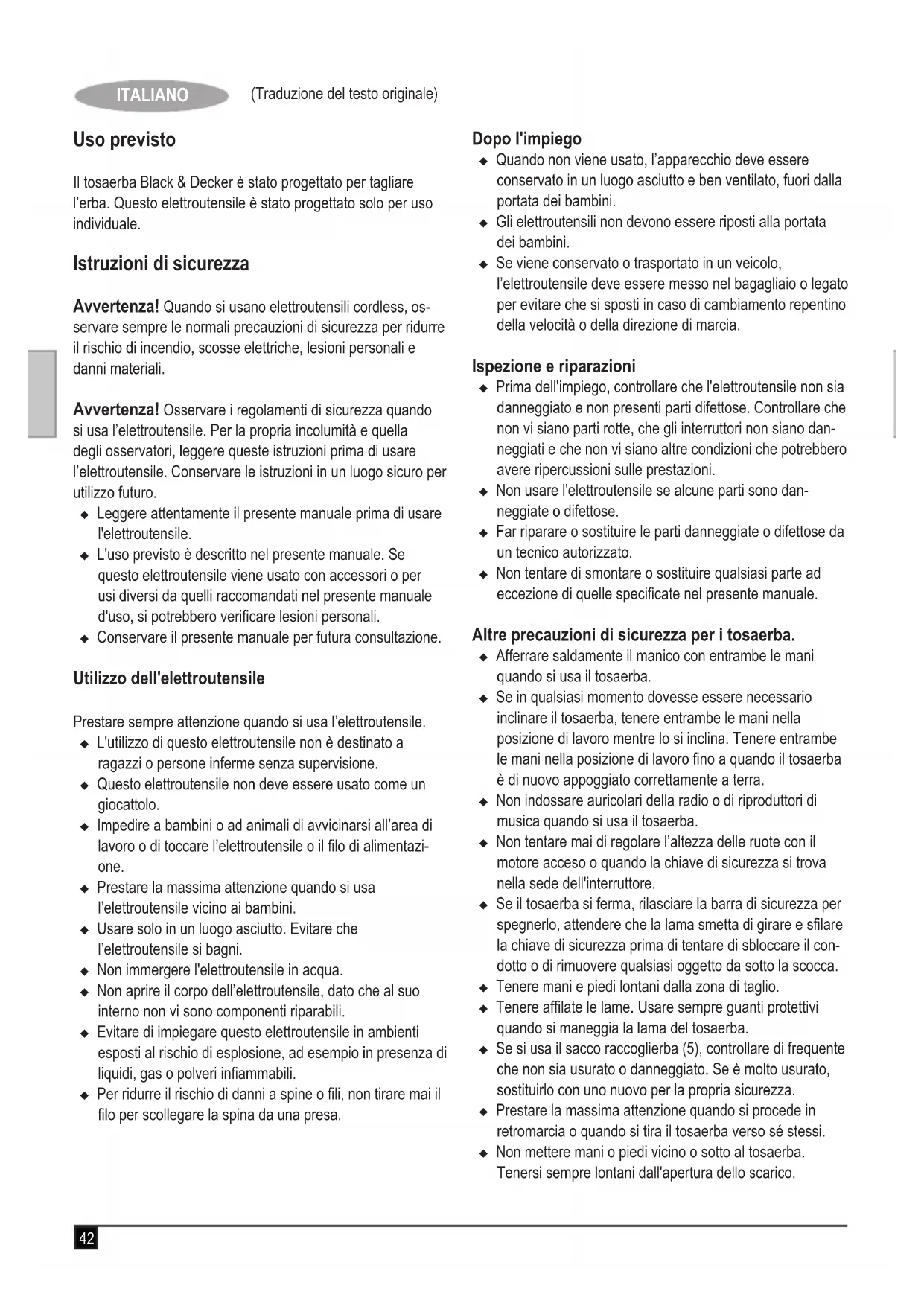 Kevin Hewitt Vice-Président - ingénierie internationale Black & Decker Europe, 210 Bath Road, Slough, Berkshire, SL1 3YD Royaume-Uni 01-10-2009 Garantie Black & Decker assure la qualité de ses produits et vous offre une garantie très élargie. Ce certicat de garantie est un docu- ment supplémentaire et ne peut en aucun cas se substituer à vos droits légaux. La garantie est valable sur tout le territoire des États Membres de l'Union Européenne et de la Zone de Libre Échange Européenne. Si un produit Black & Decker s'avère défectueux en raison de matériaux en mauvaises conditions, d'une erreur humaine, ou d'un manque de conformité dans les 24 mois suivant la date d'achat, Black & Decker garantit le remplacement des pièces défectueuses, la réparation des produits usés ou cassés ou remplace ces produits à la convenance du client, sauf dans les circonstances suivantes : u Le produit a été utilisé dans un but commercial, profes- sionnel, ou a été loué; u Le produit a été mal utilisé ou utilisé avec négligence;u Le produit a subi des dommages à cause d'objets étrangers, de substances ou à cause d'accidents; u Des réparations ont été tentées par des techniciens ne faisant pas partie du service technique de Black & Decker. Pour avoir recours à la garantie, il est nécessaire de fournir une preuve d'achat au vendeur ou à un réparateur agréé. Pour connaître l'adresse du réparateur agréé le plus proche de chez vous, contactez le bureau Black & Decker à l'adresse indiquée dans ce manuel. Vous pourrez aussi trouver une liste de réparateurs agréés Black & Decker et de plus amples détails sur notre service après-vente sur le site Internet à l'adresse suivante : www.2helpU.com Visitez notre site Web www.blackanddecker.fr pour enregistrer votre nouveau produit Black & Decker et être informé des nouveaux produits et des offres spéciales. Pour plus d'informations concernant la marque Black & Decker et notre gamme de produits, consultez notre site www.blackanddecker. fr42 (Traduzione del testo originale) ITALIANO Uso previsto Il tosaerba Black & Decker è stato progettato per tagliare l’erba. Questo elettroutensile è stato progettato solo per uso individuale. Istruzioni di sicurezza Avvertenza! Quando si usano elettroutensili cordless, os- servare sempre le normali precauzioni di sicurezza per ridurre il rischio di incendio, scosse elettriche, lesioni personali e danni materiali. Avvertenza! Osservare i regolamenti di sicurezza quando si usa l’elettroutensile. Per la propria incolumità e quella degli osservatori, leggere queste istruzioni prima di usare l’elettroutensile. Conservare le istruzioni in un luogo sicuro per utilizzo futuro. u Leggere attentamente il presente manuale prima di usare l'elettroutensile. u L'uso previsto è descritto nel presente manuale. Se questo elettroutensile viene usato con accessori o per usi diversi da quelli raccomandati nel presente manuale d'uso, si potrebbero vericare lesioni personali. u Conservare il presente manuale per futura consultazione. Utilizzo dell'elettroutensile Prestare sempre attenzione quando si usa l’elettroutensile. u L'utilizzo di questo elettroutensile non è destinato a ragazzi o persone inferme senza supervisione. u Questo elettroutensile non deve essere usato come un giocattolo. u Impedire a bambini o ad animali di avvicinarsi all’area di lavoro o di toccare l’elettroutensile o il lo di alimentazi- one. u Prestare la massima attenzione quando si usa l’elettroutensile vicino ai bambini. u Usare solo in un luogo asciutto. Evitare che l’elettroutensile si bagni. u Non immergere l'elettroutensile in acqua. u Non aprire il corpo dell’elettroutensile, dato che al suo interno non vi sono componenti riparabili. u Evitare di impiegare questo elettroutensile in ambienti esposti al rischio di esplosione, ad esempio in presenza di liquidi, gas o polveri inammabili. u Per ridurre il rischio di danni a spine o li, non tirare mai il lo per scollegare la spina da una presa. Dopo l'impiego u Quando non viene usato, l’apparecchio deve essere conservato in un luogo asciutto e ben ventilato, fuori dalla portata dei bambini. u Gli elettroutensili non devono essere riposti alla portata dei bambini. u Se viene conservato o trasportato in un veicolo, l’elettroutensile deve essere messo nel bagagliaio o legato per evitare che si sposti in caso di cambiamento repentino della velocità o della direzione di marcia. Ispezione e riparazioni u Prima dell'impiego, controllare che l'elettroutensile non sia danneggiato e non presenti parti difettose. Controllare che non vi siano parti rotte, che gli interruttori non siano dan- neggiati e che non vi siano altre condizioni che potrebbero avere ripercussioni sulle prestazioni. u Non usare l'elettroutensile se alcune parti sono dan- neggiate o difettose. u Far riparare o sostituire le parti danneggiate o difettose da un tecnico autorizzato. u Non tentare di smontare o sostituire qualsiasi parte ad eccezione di quelle specicate nel presente manuale. Altre precauzioni di sicurezza per i tosaerba. u Afferrare saldamente il manico con entrambe le mani quando si usa il tosaerba. u Se in qualsiasi momento dovesse essere necessario inclinare il tosaerba, tenere entrambe le mani nella posizione di lavoro mentre lo si inclina. Tenere entrambe le mani nella posizione di lavoro no a quando il tosaerba è di nuovo appoggiato correttamente a terra. u Non indossare auricolari della radio o di riproduttori di musica quando si usa il tosaerba. u Non tentare mai di regolare l’altezza delle ruote con il motore acceso o quando la chiave di sicurezza si trova nella sede dell'interruttore. u Se il tosaerba si ferma, rilasciare la barra di sicurezza per spegnerlo, attendere che la lama smetta di girare e slare la chiave di sicurezza prima di tentare di sbloccare il con- dotto o di rimuovere qualsiasi oggetto da sotto la scocca. u Tenere mani e piedi lontani dalla zona di tagli
