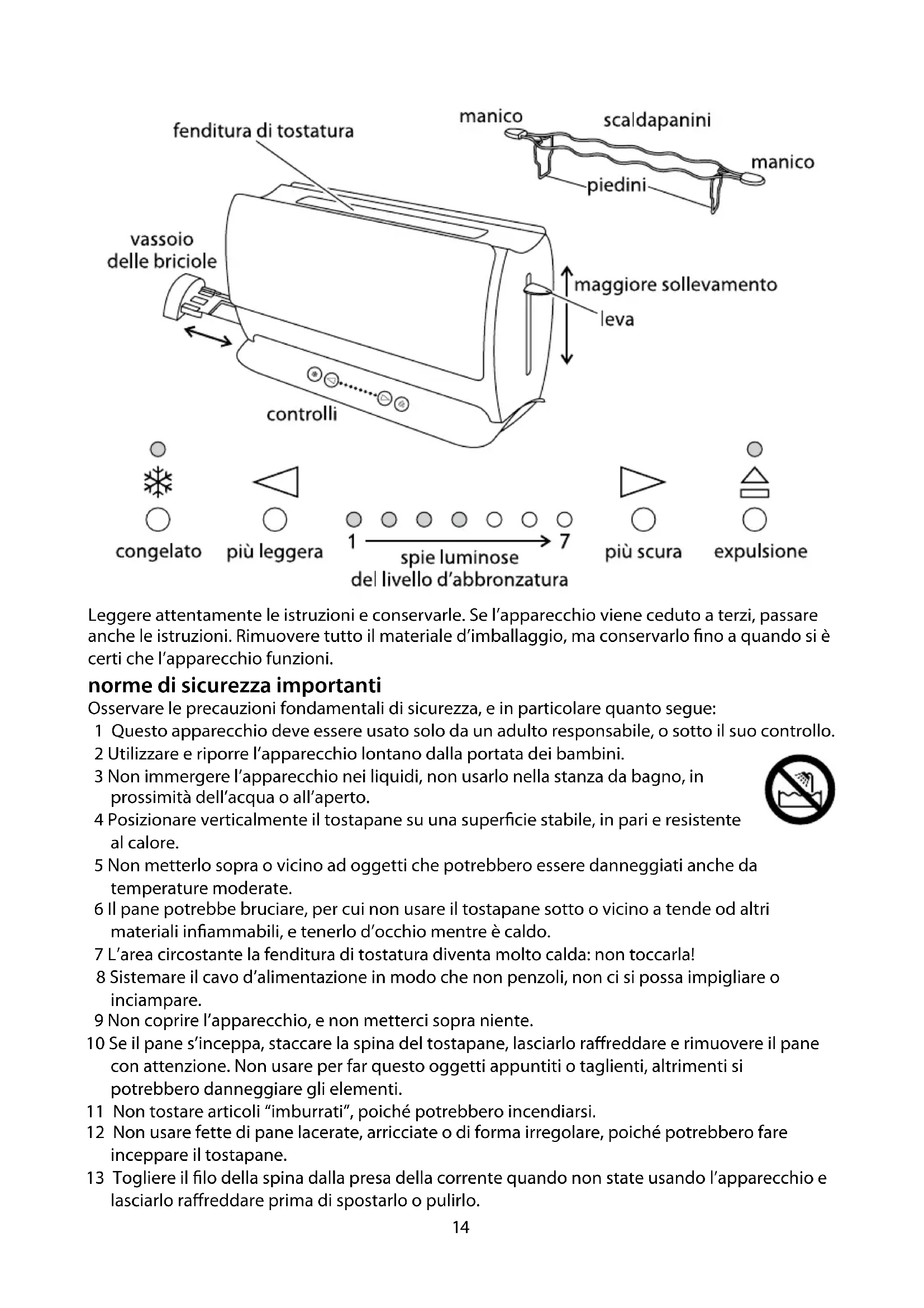 - Si può produrre un certo odore, ma non è da preoccuparsi. Assicurarsi però che la stanza sia ben ventilata. tostatura del pane 1 Posizionare verticalmente il tostapane su una superficie stabile, in pari e resistente al calore. 2 Non metterlo sopra o vicino ad oggetti che potrebbero essere danneggiati anche da temperature moderate. 3 Il pane potrebbe bruciare, per cui non usare il tostapane sotto o vicino a tende od altri materiali infiammabili, e tenerlo d’occhio mentre è caldo. 4 Inserire la spina nella presa di corrente. 5 L’apparecchio effettuerà prima un controllo di routine. 6 Si accenderanno le quattro spie luminose di sinistra del livello d’abbronzatura. 7 Usare i pulsanti ad entrambe le estremità delle spie luminose del livello d’abbronzatura per rendere più leggera % o più scura & l’abbronzatura del toast. 8 Le spie luminose d’abbronzatura si accendono/spengono per indicare il livello prescelto. 9 Quante più spie s’accendono tanto più scura sarà l’abbronzatura del toast. 10 Metta una fetta di pane (con spessore massimo di 28 mm) nella fenditura di tostatura. 11 Premere completamente in giù la leva. , Se il tostapane non è collegato alla rete elettrica d’alimentazione però non si blocca. 12 Le spie del livello di tostatura si spegneranno: a) la spia a destra lampeggerà, le spie a sinistra si accenderanno b) la spia a destra si spegnerà, la spia a sinistra lampeggerà c) fino a quando tutte le spie non si spegneranno d) quando si spegneranno tutte, il toast uscirà. espulsione $ 13 Per fermare il tostapane a metà ciclo, sfiorare $. 14 la spia $ si accenderà, il toast verrà espulso, poi la spia $ si spegnerà.16 maggiore sollevamento 15 Dopo avere tostato articoli piccoli (come ciambelline, focaccine, ecc.) la leva può essere fatta sollevare di più per facilitare la loro rimozione. pane congelato f 16 Impostare il comando della tostatura al livello desiderato, inserire il pane congelato, abbassare la leva, poi sfiorare f. 17 Si accende ora la spia luminosa f e il tempo di tostatura viene cambiato automaticamente per ottenere lo stesso livello d’abbronzatura del pane non congelato. scaldapanini , Utilizzare lo scaldapanini solo sul livello di doratura 1. 18 Non utilizzate lo scaldapanini per scaldare panini congelati, imburrati, ricoperti, ghiacciati o ripieni. 19 Posizionate lo scaldapanini sopra al tostapane, con i piedini nella fenditura. 20 Mettete i panini dentro alla scaldapanini. 21 Impostate il livello d’abbronzatura su 1, abbassate quindi la leva. 22 Quando la leva salta su, togliere i panini scaldati. 23 Non toccate i fili dello scaldapanini – sono molto caldi. 24 Rimuovere lo scaldapanini prima di utilizzare il tostapane normalmente. come riscaldare il toast 25 Selezionare il livello più basso d’abbronzatura. Riscaldare solo i toast normali, non quelli “imburrati”. consigli e suggerimenti 26 Quando si deve tostare più di una fetta di pane, usare fette di dimensioni, spessore e freschezza simile. 27 Il pane raffermo (del giorno prima) contiene meno umidità, per cui produce toast più croccanti. 28 Il pane raffermo e sottile cuoce più rapidamente di quello fresco o spesso: usare perciò una regolazione più bassa. 29 Il prodotti dolci (focaccine da tè, dolci alla frutta, ecc.) s’abbronzano molto più rapidamente del pane ordinario, per cui bisogna tostarli con una regolazione più bassa. cura e manutenzione 30 Staccare la spina del tostapane e lasciarlo raffreddare. 31 Passare un panno inumidito sulle superfici esterne dell’apparecchio per pulirlo. 32 Rimuovere e vuotare il vassoio delle briciole. Pulirlo usando un panno inumidito, asciugarlo e rimetterlo nel tostapane. 33 Non usare il tostapane senza avere montato e chiuso il vassoio per le briciole. 34 Non immergete l’apparecchio in acqua od in altri liquidi. 35 Non usare prodotti di pulizia ruvidi o abrasivi, né solventi. simbolo bidone della spazzatura su ruote Per evitare danni all’ambiente e alla salute causati da sostanze pericolose delle parti elettriche ed elettroniche, gli apparecchi contrassegnati da questo simbolo non devono essere smaltiti con i rifiuti indifferenziati, ma recuperati, riutilizzati o riciclati.1718 Lea las instrucciones y guárdelas en un lugar seguro. Si da el aparato a otro, pase también las instrucciones. Quite todo el embalaje, y guárdelo hasta que sepa que el aparato funciona bien. seguridad importante Siga las precauciones básicas de seguridad, incluyendo: 1 Este aparato deberá ser usado por, o bajo la supervisión de un adulto responsable. 2 Use y guarde el aparato fuera del alcance de los niños. 3 No ponga el aparato en líquido, no lo use en un cuarto de baño, cercano a agua, o al aire libre. 4 Ponga el tostador sobre su base en una superficie firme, nivelada y resistente al calor. 5 No lo ponga sobre o cercana a algo que pueda ser dañado incluso por un calor moderado. 6 El pan puede quemarse. No use el aparato cercano a, o debajo de, las cortinas u otros materiales combustibles y vigílelo mientras está caliente. 7 La zona en el entorno de la ranura se calienta mucho — ¡no la toque! 8 Coloque el cable de manera que no sobresalga, y alguien pueda tropezar en él o engancharlo. 9 No cubra el aparato ni ponga nada sobre él. 10 Si se atasca el pan, desenchufe el tostador, déjela enfriar y saque el pan con cuidado. No use algo puntiagudo para hacer esto, dañará las resistencias. 11 No tueste nada con mantequilla, puede incendiarse. 12 No use pan roto, curvado o deformado, podría atascar el tostador. 13 Cuando no lo use, desenchufe el aparato y deje que se enfríe antes de moverlo o limpiarlo. 14 Limpie frecuentemente las migas que caigan en el tostador, para evitar que se acumulen. Esto no es higiénico y podría causar un peligro de incendio.19 instrucciones 15 No use el tostador a menos que la bandeja recogemigas esté correctamente colocada y cerrada. 16 Mantenga el aparato y el cable fuera de platos de co