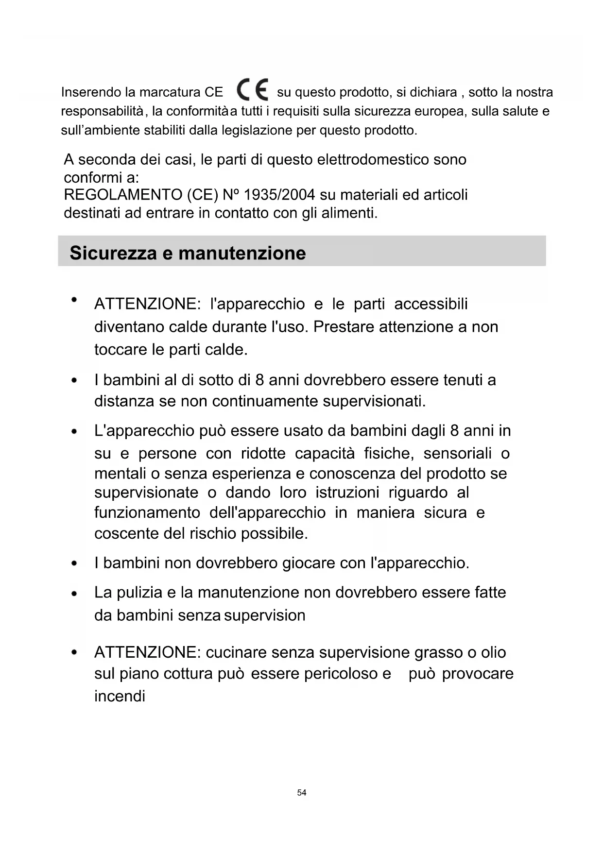 læse skemaet over fejl og mulige årsager angivet på de foregående sider. Hvis årsagen til fejlen herefter ikke er fundet, bedes De : slukke for apparatet og kontakte Kundeservice. 52Særlig erklæring Indholdet i denne manual er blevet kontrolleret omhyggeligt. Fabrikanten fraskriver sig ansvar for trykfejl og eventuelle udeladelser opstået under trykningen. Herudover kan der ved en eventuel revidering af brugervejledningen blive tilføjet tekniske ændringer uden forudgående varsel. Det afbillede produkt er det aktuelle. ADVARSEL: dette produkt må ikke bortskaffes sammen med almindeligt husholdningsaffald. Det skal bortskaffes separat. Dette husholdningsapparat er fremstillet i overensstemmelse med det europæiske direktiv 2012/19/EC om bortskaffelse af elektrisk og elektronisk udstyr. Ved overholdelse af direktiverne omkring bortskaffelse af dette husholdningsapparat forebygges eventuelle skader på miljøet og på sundheden, som en forkert bortskaffelse ellers kan medføre. Dette symbol angiver, at produktet ikke må bortskaffes som almindeligt husholdningsaffald, men at det skal bortskaffes via særlige centre for For yderligere oplysninger om behandling, bortskaffelse og genanvendelse af dette produkt bedes De kontakte Deres kommune eller henvende Dem til forretningen, hvor produktet er blevet købt. genanvendelse af elektrisk og elektronisk materiale. DANISH 53ATTENZIONE: l'apparecchio e le parti accessibili diventano calde durante l'uso. Prestare attenzione a non toccare le parti calde. I bambini al di sotto di 8 anni dovrebbero essere tenuti a distanza se non continuamente supervisionati. L'apparecchio può essere usato da bambini dagli 8 anni in su e persone con ridotte capacità fisiche, sensoriali o mentali o senza esperienza e conoscenza del prodotto se supervisionate o dando loro istruzioni riguardo al funzionamento dell'apparecchio in maniera sicura e coscente del rischio possibile. I bambini non dovrebbero giocare con l'apparecchio. La pulizia e la manutenzione non dovrebbero essere fatte da bambini senza supervision ATTENZIONE: cucinare senza supervisione grasso o olio sul piano cottura può essere pericoloso e può provocare incendi Sicurezza e manutenzione Inserendo la marcatura CE su questo prodotto, si dichiara , sotto la nostra responsabilità , la conformità a tutti i requisiti sulla sicurezza europea, sulla salute e sull’ambiente stabiliti dalla legislazione per questo prodotto. A seconda dei casi, le parti di questo elettrodomestico sono conformi a: REGOLAMENTO (CE) Nº 1935/2004 su materiali ed articoli destinati ad entrare in contatto con gli alimenti. 54ATTENZIONE: Se la superficie è incrinata, spegnere l’apparecchio per evitare la possibilità di scosse elettriche. non utilizzare un pulitore a vapore. Oggetti metallici quali coltelli, forchette, cucchiai o coperchi non dovrebbero essere posti sulla superficie del piano di cottura perché possono scaldarsi. rimuovere gli eventuali liquidi tracimati dal coperchio prima di aprirlo. Far raffreddare la superficie del piano di cottura prima di chiudere il coperchio. Dopo l’uso, spegnere il piano di cottura tramite il suo dispositivo di comando e non fare affidamento sul rivelatore di pentole. L'apparecchio non è progettato per funzionare con un timer esterno o con un sistema di comando separato . Il mezzo di disconnessione deve essere incorporato nel cablaggio fisso in accordo con le leggi di cablaggio . ATTENZIONE: pericolo di incendo: non lasciare oggetti sul piano cottura. ITALIAN MAI provare a spegnere il fuoco con acqua. Prima spegnere l'apparecchio e poi coprire le fiamme, ad esempio con un coperchio o un telo non infiammabile. 55assistenza tecnica o comunque da una persona con qualifica similare, in modo da prevenire ogni rischio. ATTENZIONE: Al fine di evitare ogni pericolo dovuto al riarmo accidentale del dispositivo termico di interruzione, il presente apparecchio non deve essere alimentato con un dispositivo di manovra esterno, quale un temporizzatore oppure essere connesso a un circuito che viene regolarmente alimentato o disalimentato dal servizio. Se il cavo di alimentazione è danneggiato, esso deve essere sostituito dal costruttore o dal suo servizio le istruzioni devono indicare quale tipo di cavo debba essere utilizzato, tenendo presente la temperatura della superficie posteriore dell’apparecchio. 56Il dispositivo di scollegamento deve essere incluso nel cablaggio fisso, in accordo con le normative relative al cablaggio. Le istruzioni riportano il tipo di cavo da utilizzare, tenendo in considerazione la temperatura della superficie posteriore dell'elettrodomestico. AVVERTENZA: Utilizzare unicamente protezioni per piani di cottura progettate dal produttore della cucina o indicate dal produttore dell'elettrodomestico nelle istruzioni d'uso come adatte, o ancora protezioni incorporate nell'elettrodomestico. L'utilizzo di protezioni non adatte può provocare incidenti.