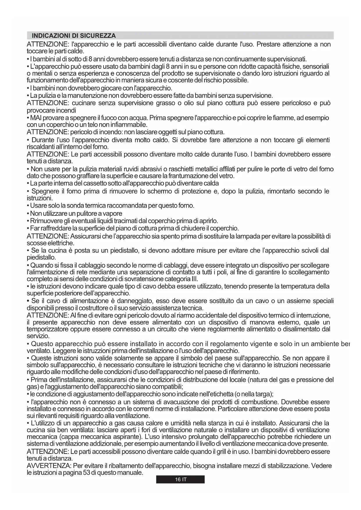 - L'utilizzo di un apparecchio a gas causa calore e umidità nella stanza in cui è installato. Assicurarsi che la cucina sia ben ventilata: lasciare aperti i fori di ventilazione naturale o installare un dispositivi di ventilazione meccanica (cappa meccanica aspirante). L'uso intensivo prolungato dell'apparecchio potrebbe richiedere un sistema di ventilazione addizionale, per esempio aumentando il livello di ventilazione meccanica dove presente. ATTENZIONE: Le parti accessibili possono diventare calde quando il grill è in uso. I bambini dovrebbero essere tenuti a distanza. AVVERTENZA: Per evitare il ribaltamento dell'apparecchio, bisogna installare mezzi di stabilizzazione. Vedere le istruzioni a pagina 53 di questo manuale. 16 IT