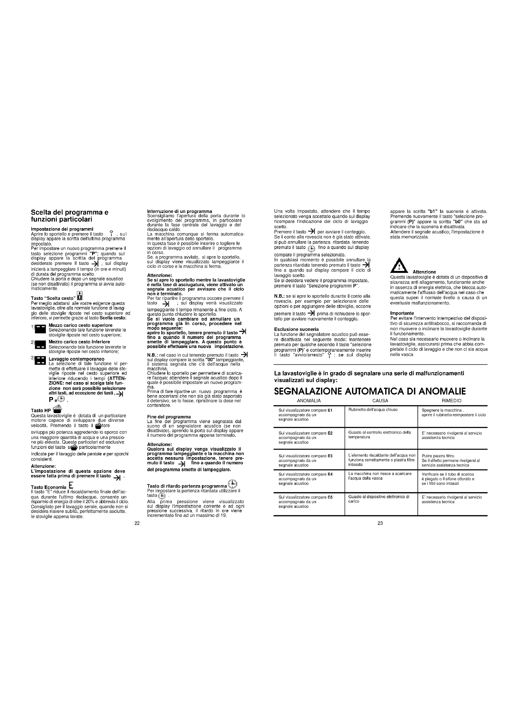 Una volta impostato, attendere che il tempo selezionato venga accettato quando sul display ricompare l'indicazione del ciclo di lavaggio scelto. Premere il tasto per avviare il conteggio. Se il conto alla rovescia non è già stato attivato, si può annullare la partenza ritardata tenendo premuto il tasto fino a quando sul display compare il programma selezionato. In qualsiasi momento è possibile annullare la partenza ritardata tenendo premuto il tasto fino a quando sul display compare il ciclo di lavaggio scelto. Se si desidera vedere il programma impostato, premere il tasto "Selezione programmi P". N.B.: se si apre lo sportello durante il conto alla rovescia, per esempio per selezionare delle opzioni o per aggiungere delle stoviglie, occorre premere il tasto prima di richiudere lo spor- tello per avviare nuovamente il conteggio. Esclusione suoneria La funzione del segnalatore acustico può esse- re disattivata nel seguente modo: mantenere premuto per qualche secondo il tasto "selezione programmi (P)" e contemporaneamente inserire il tasto "avvio/arresto" ; se sul display appare la scritta "b1" la suoneria è attivata. Premendo nuovamente il tasto "selezione pro- grammi (P)" appare la scritta "b0" che sta ad indicare che la suoneria è disattivata. Attendere il segnale acustico; l'impostazione è stata memorizzata. Attenzione Questa lavastoviglie è dotata di un dispositivo di sicurezza anti allagamento, funzionante anche in assenza di energia elettrica, che blocca auto- maticamente l'afflusso dell'acqua nel caso che questa superi il normale livello a causa di un eventuale malfunzionamento. Importante Per evitare l'intervento intempestivo del disposi- tivo di sicurezza antitrabocco, si raccomanda di non muovere o inclinare la lavastoviglie durante il funzionamento. Nel caso sia necessario muovere o inclinare la lavastoviglie, assicurarsi prima che abbia com- pletato il ciclo di lavaggio e che non ci sia acqua nella vasca Sul visualizzatore compare E1 accompagnato da un segnale acustico Sul visualizzatore compare E2 accompagnato da un segnale acustico Sul visualizzatore compare E3 accompagnato da un segnale acustico Sul visualizzatore compare E4 accompagnato da un segnale acustico Sul visualizzatore compare E5 accompagnato da un segnale acustico