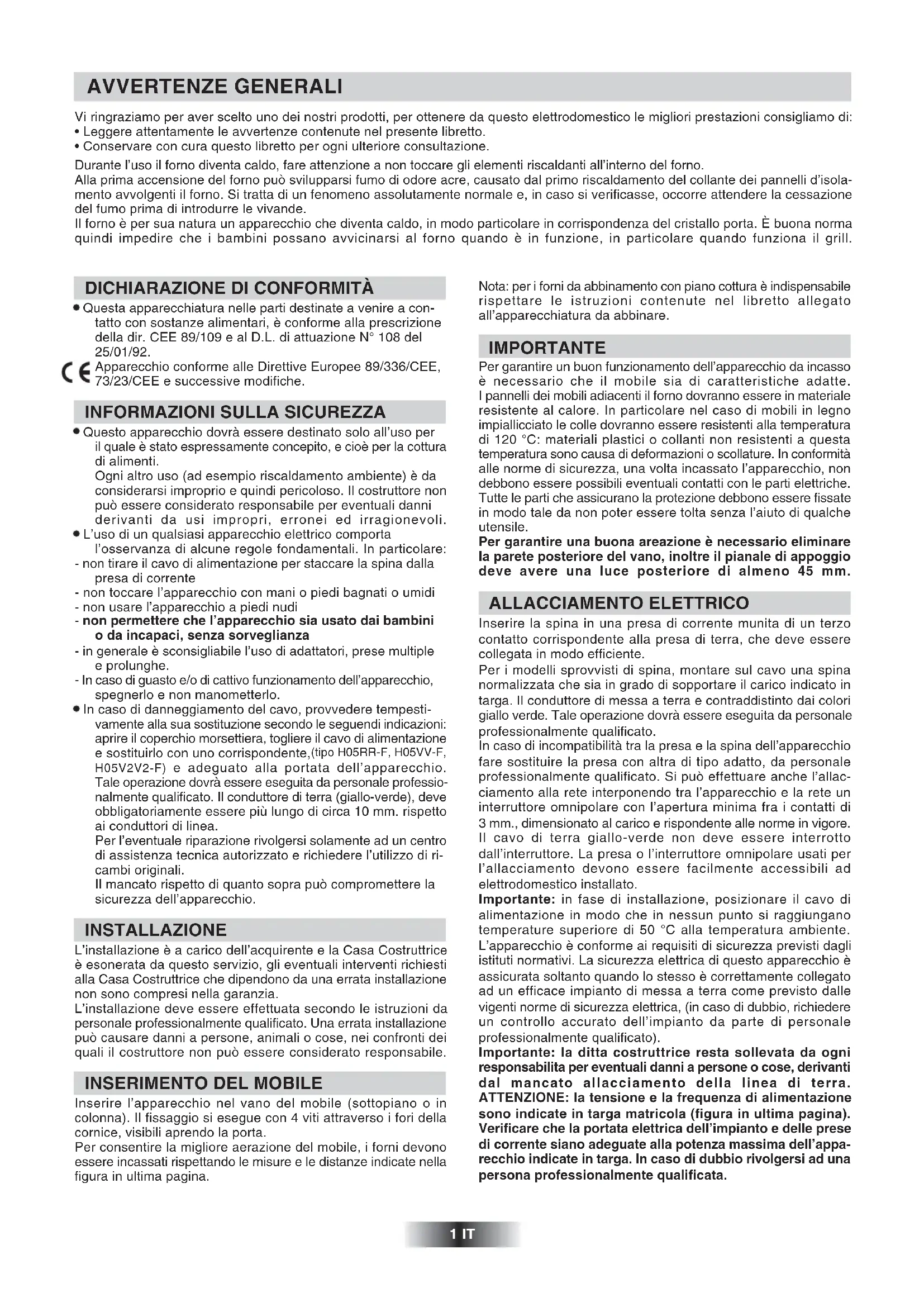 - Conservare con cura questo libretto per ogni ulteriore consultazione. Durante l’uso il forno diventa caldo, fare attenzione a non toccare gli elementi riscaldanti all’interno del forno. Alla prima accensione del forno può svilupparsi fumo di odore acre, causato dal primo riscaldamento del collante dei pannelli d’isola- mento avvolgenti il forno. Si tratta di un fenomeno assolutamente normale e, in caso si verificasse, occorre attendere la cessazione del fumo prima di introdurre le vivande. Il forno è per sua natura un apparecchio che diventa caldo, in modo particolare in corrispondenza del cristallo porta. È buona norma quindi impedire che i bambini possano avvicinarsi al forno quando è in funzione, in particolare quando funziona il grill. AVVERTENZE GENERALI 1 IT