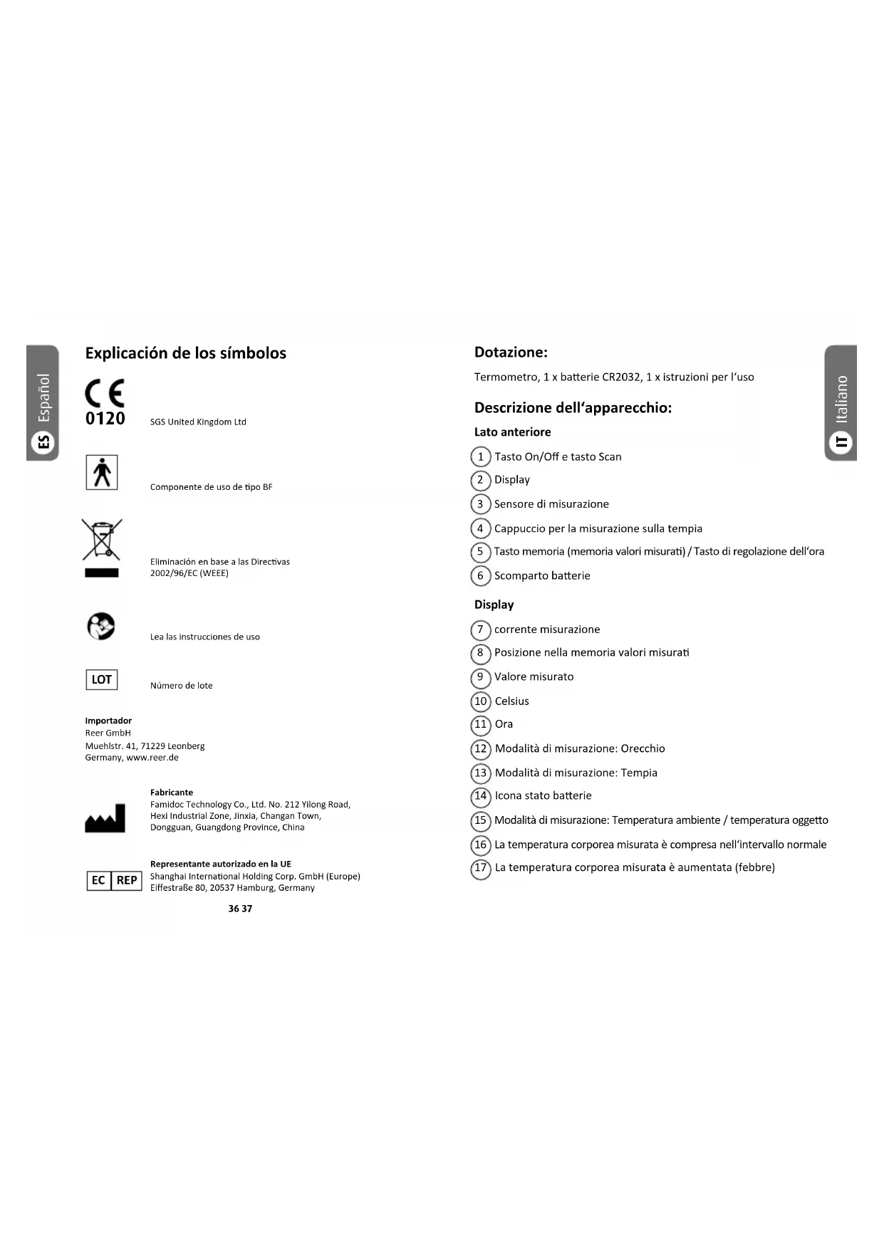 IT Italiano CR2032press! press! 2–3 sec L‘apparecchio non è resistente all‘acqua e non deve quindi essere immerso nell‘acqua, né esposto direamente al contao con liquidi. Il modo „Temperatura oggeo/ambiente“ indica solo la temperatura di radiazione della temperatura della supercie o dell‘ambiente e non fornisce alcuna indicazione sulla temperatura corporea. Questo modo di misurazione non può essere quindi impiegato per la misurazione della febbre. Rimuovere acqua, polvere o sporcizia dagli ogge da misurare per omizzare la precisione di misurazione.44 45 Soluzione problemi Problema/simbolo L‘apparecchio non si accende Valori di tempe- ratura erra o oscillan Possibile causa Le baerie sono scariche. Sensore sporco/guasto Stato di carica delle baerie: basso. Impossibile eseguire misurazioni. Baerie esaurite; non è più possibile eseguire misurazioni. La temperatura di funzi- onamento si trova al di fuori dell‘intervallo termico consento di 15°C – 40°C. La temperatura corporea misurata è superiore a 42,9°C. La temperatura oggeo/ ambiente misurata è superiore a 100°C. La temperatura corporea misurata è inferiore a 32°C. La temperatura oggeo/ ambiente misurata è inferiore a 0°C. Provvedimen Inserire nuove baerie. Controllare il sensore di misurazione e pulirlo come descrio a pagina 43. Sostuire a breve le baerie. Sostuire immediatamente le baerie. Spostare il termometro in un luogo la cui temperatura sia compresa nell‘intervallo consento. Lasciar accli- matare il termometro per almeno un‘ora. Vericare modo di misurazione (temperatura corporea / temperatura oggeo). Ripetere la misurazione. Fare aenzione al correo posizionamento del senso- re di misurazione. Vericare modo di misurazione (temperatura corporea / temperatura oggeo). Ripetere la misurazione. Fare aenzione al correo posizionamento del senso- re di misurazione. IT Italiano Da tecnici Controllo della tecnologia di misurazione Una verica del termometro di norma non è necessaria. Per gli apparecchi impiega nella prassi clinica la disposizione di legge per gli ulizzatori di prodo medicali del 29 giugno 1998 prescrive un controllo della tecnologia di misurazi- one ogni 2 anni. Tecnologia di misurazione Campo di misura Precisione della misurazione Durata misurazione Memoria valori misura Indicatore di misurazione Modalità di risparmio energeco Dimensioni Peso Baerie Grado di protezione Condizioni di funzionamento Condizioni di conservazione Tecnologia ad infrarossi Temperatura corporea: 32,0°C – 42,9°C Temperatura oggeo/ambiente: 0°C – 100°C Temperatura corporea: +/- 0,2°C (35,5°C - 42,0°C); +/- 0,3°C (< 35,5°C/ > 42,0°C) Temperatura oggeo/ambiente: +/- 1°C (15,0°C - 60,0°C); +/- 2°C (< 15,0°C/ > 60,0°C) 1 secondo 19 misurazioni Display a cristalli liquidi (LCD) 30 secondi dopo l‘ulma misurazione 133,8 x 32,7 x 23 mm 39 g (baerie incluse) DC 3V, CR2032 (in dotazione) IP22 Temperatura ambiente: 15°C – 40°C, umidità relava: 20% - 95%, pressione atmosferica: 70-106 KPa Temperatura ambiente: -25°C – 55°C, umidità relava: ≤ 95% rel., pressione atmosferica: 70-106 KPa IT Italiano46 47 IT Italiano Generale Condizioni giuridiche per la commercializzazione nell‘UE:Il produore è stato cercato dall‘organismo nocato UE „SGS United Kingdom Ltd.“ ai sensi della Direva 93/42/CEE sui prodo medicali. Il presente apparecchio è conforme alla norma europea EN60601-1-2 sulla tollerabilità eleromagneca e alle „Speciche standard per i termometri ad infrarossi per la misurazione intermiente della temperatura del paziente“ ASTM E 1965.GaranziaConservare lo scontrino di cassa, le istruzioni per l‘uso e il numero dell‘arcolo.Eventuali richieste di garanzia o diri di garanzia devono essere ges esclusi-vamente con il rivenditore. Tu i da tecnici, le informazioni e le caraerische del prodoo descrio in questa opera sono sta elabora in buona coscienza e corrispondono allo stato auale al momento della pubblicazione. Le informazioni messe a disposizione da reer dovrebbero essere corree ed adabili. reer non si assume comunque alcuna responsabilità per eventuali errori contenu in questo documento e si riserva il dirio di modicare senza preavviso il design del prodoo e le sue speciche. L‘eventuale copia e trasmissione (anche parziale) di informazioni delle presen istruzioni per l‘uso, sooposte al dirio d`autore, in qualsiasi forma o in qualsiasi modalità, graca, eleronica o meccanica, mediante fotocopie, riproduzioni audio o registrazione su un sistema di recupero da, necessita previa autorizzazione scria da parte di reer. Prescrizioni in materia di tutela ambientale: Al termine della sua vita il presente prodoo non può essere smalto tra i normali riu domesci, ma va consegnato ad un centro di raccolta per il riciclo di apparecchi elerici. Indicato dal simbolo sul prodoo, nelle istruzioni per l‘uso o sulla confezio-ne. I materiali sono riulizzabili conformemente al loro contrassegno. Non geare le baerie usate tra i riu domesci, ma tra i riu speciali o consegnarle in un punto di raccolta baerie in u negozio specializzato. Con il riulizzo, il recupero dei materiali o altre forme di riciclo di apparecchi usa fornirete un importante contributo alla tutela dell‘ambiente. Informatevi presso la vostra amministrazione comunale su dove siano colloca i pun di raccolta per lo smalmento dei riu. IT Italiano Importato daReer GmbHMuehlstr. 41, 71229 LeonbergGermany, www.reer.deRappresentante autorizzato per l‘UEShanghai Internaonal Holding Corp. GmbH (Europe)Eiestraße 80, 20537 Hamburg, Germany EC REP Numero loo LOT Legenda Leggere le istruzioni per l‘usoSmalmento conforme alle direve 2002/96/EC (WEEE) Prodoo daFamidoc Technology Co., Ltd. No. 212 Yilong Road, Hexi Industrial Zone, Jinxia, Changan Town, Dongguan, Guangdong Province, China