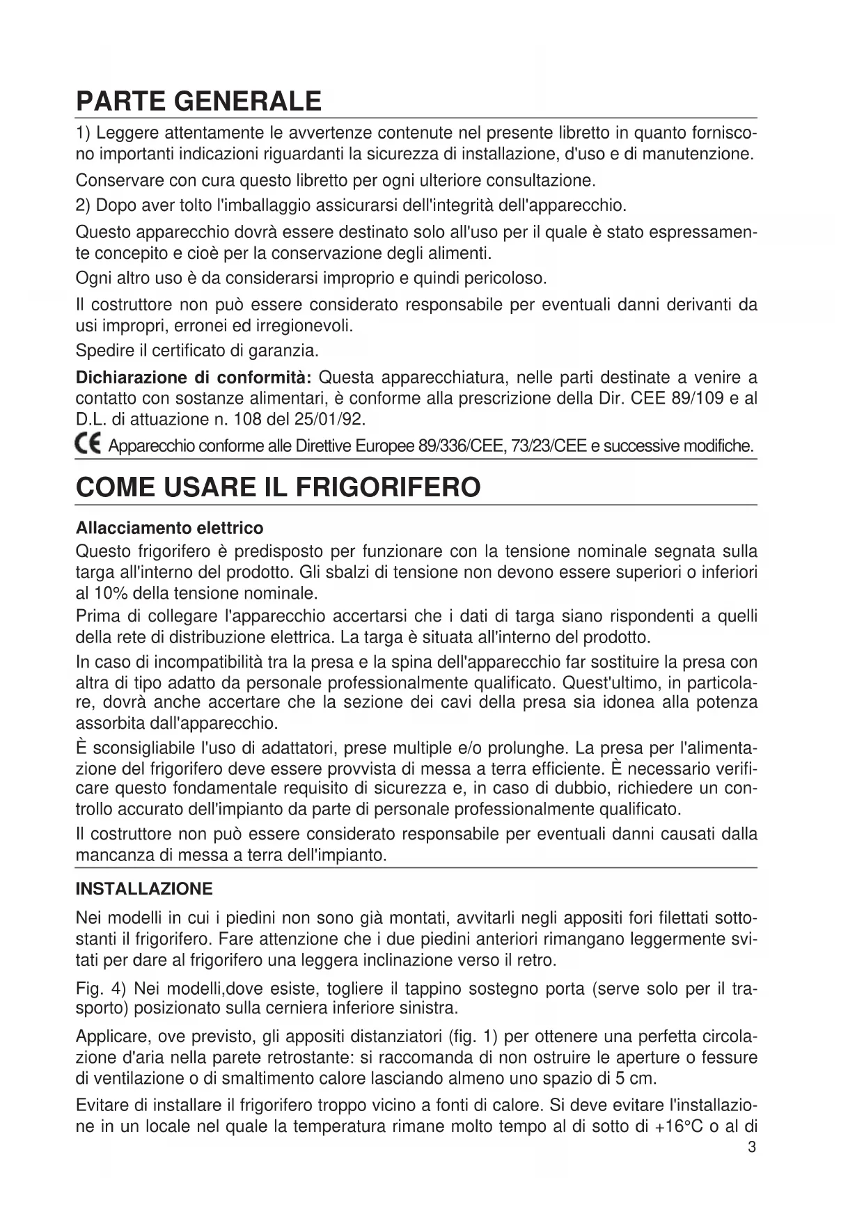 Allacciamento elettrico Questo frigorifero è predisposto per funzionare con la tensione nominale segnata sulla targa all'interno del prodotto. Gli sbalzi di tensione non devono essere superiori o inferiori al 10% della tensione nominale. Prima di collegare l'apparecchio accertarsi che i dati di targa siano rispondenti a quelli della rete di distribuzione elettrica. La targa è situata all'interno del prodotto. In caso di incompatibilità tra la presa e la spina dell'apparecchio far sostituire la presa con altra di tipo adatto da personale professionalmente qualificato. Quest'ultimo, in particola- re, dovrà anche accertare che la sezione dei cavi della presa sia idonea alla potenza assorbita dall'apparecchio. È sconsigliabile l'uso di adattatori, prese multiple e/o prolunghe. La presa per l'alimenta- zione del frigorifero deve essere provvista di messa a terra efficiente. È necessario verifi- care questo fondamentale requisito di sicurezza e, in caso di dubbio, richiedere un con- trollo accurato dell'impianto da parte di personale professionalmente qualificato. Il costruttore non può essere considerato responsabile per eventuali danni causati dalla mancanza di messa a terra dell'impianto. INSTALLAZIONE Nei modelli in cui i piedini non sono già montati, avvitarli negli appositi fori filettati sotto- stanti il frigorifero. Fare attenzione che i due piedini anteriori rimangano leggermente svi- tati per dare al frigorifero una leggera inclinazione verso il retro. Fig. 4) Nei modelli,dove esiste, togliere il tappino sostegno porta (serve solo per il tra- sporto) posizionato sulla cerniera inferiore sinistra. Applicare, ove previsto, gli appositi distanziatori (fig. 1) per ottenere una perfetta circola- zione d'aria nella parete retrostante: si raccomanda di non ostruire le aperture o fessure di ventilazione o di smaltimento calore lasciando almeno uno spazio di 5 cm. Evitare di installare il frigorifero troppo vicino a fonti di calore. Si deve evitare l'installazio- ne in un locale nel quale la temperatura rimane molto tempo al di sotto di +16°C o al di 3sopra di +38÷43°C. Per i frigoriferi a due porte assicurarsi che il tubo di scarico dell'acqua di sbrinamento termini nell'apposita bacinella di evaporazione posta sul retro del frigorife- ro sopra il compressore. Il frigorifero può essere anche installato sottopensile; in questo caso, bisogna che sia garantita la libera circolazione dell'aria, lasciando uno spazio libero di circa 5 centimetri frontalmente o nella parte posteriore del pensile. Una errata installazione può causare danni a persone, animali o cose, nei confronti dei quali il costruttore non può essere considerato responsabile. CONSIGLI PER IL CONTROLLO DELLA TEMPERATURA E PER IL RISPETTO