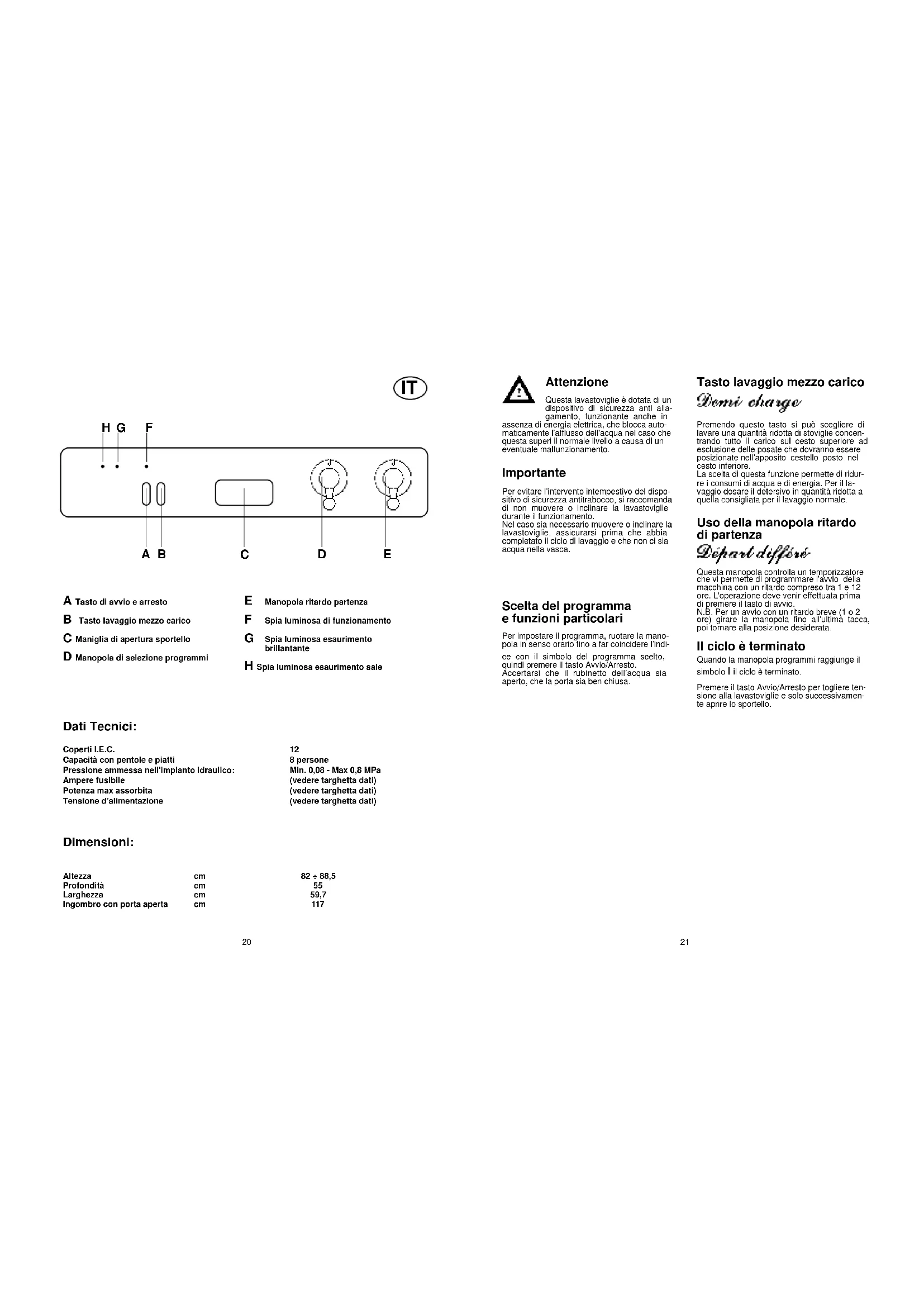 8 persone Min. 0,08 - Max 0,8 MPa (vedere targhetta dati) (vedere targhetta dati) (vedere targhetta dati) A Tasto di avvio e arresto B Tasto lavaggio mezzo carico C Maniglia di apertura sportello D Manopola di selezione programmi E Manopola ritardo partenza F Spia luminosa di funzionamento G Spia luminosa esaurimento brillantante H Spia luminosa esaurimento sale Dimensioni: Altezza Profondità Larghezza Ingombro con porta aperta