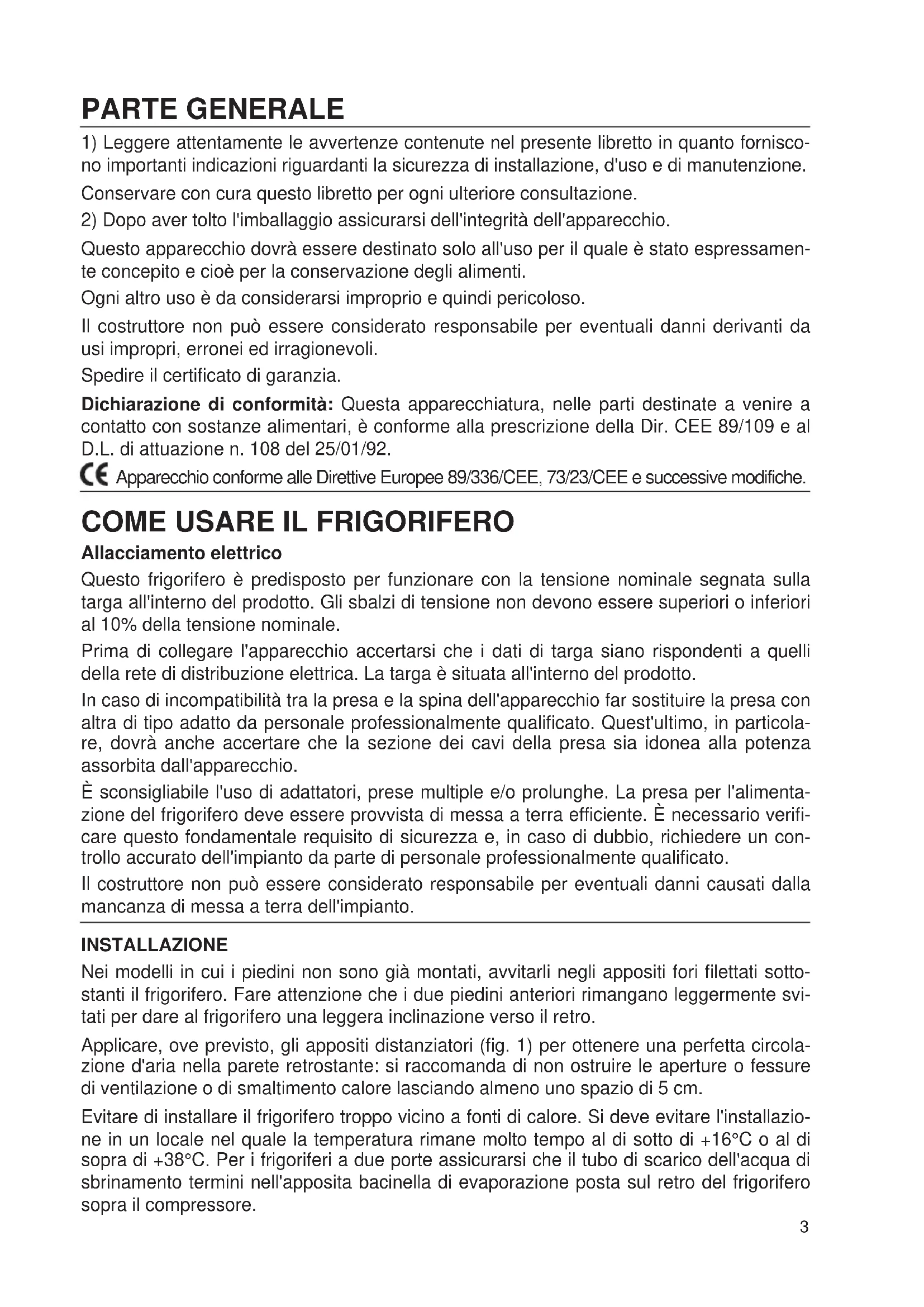 Questo apparecchio dovrà essere destinato solo all'uso per il quale è stato espressamen- te concepito e cioè per la conservazione degli alimenti. Ogni altro uso è da considerarsi improprio e quindi pericoloso. Il costruttore non può essere considerato responsabile per eventuali danni derivanti da usi impropri, erronei ed irragionevoli. Spedire il certificato di garanzia. Dichiarazione di conformità: Questa apparecchiatura, nelle parti destinate a venire a contatto con sostanze alimentari, è conforme alla prescrizione della Dir. CEE 89/109 e al D.L. di attuazione n. 108 del 25/01/92. Apparecchio conforme alle Direttive Europee 89/336/CEE, 73/23/CEE e successive modifiche.