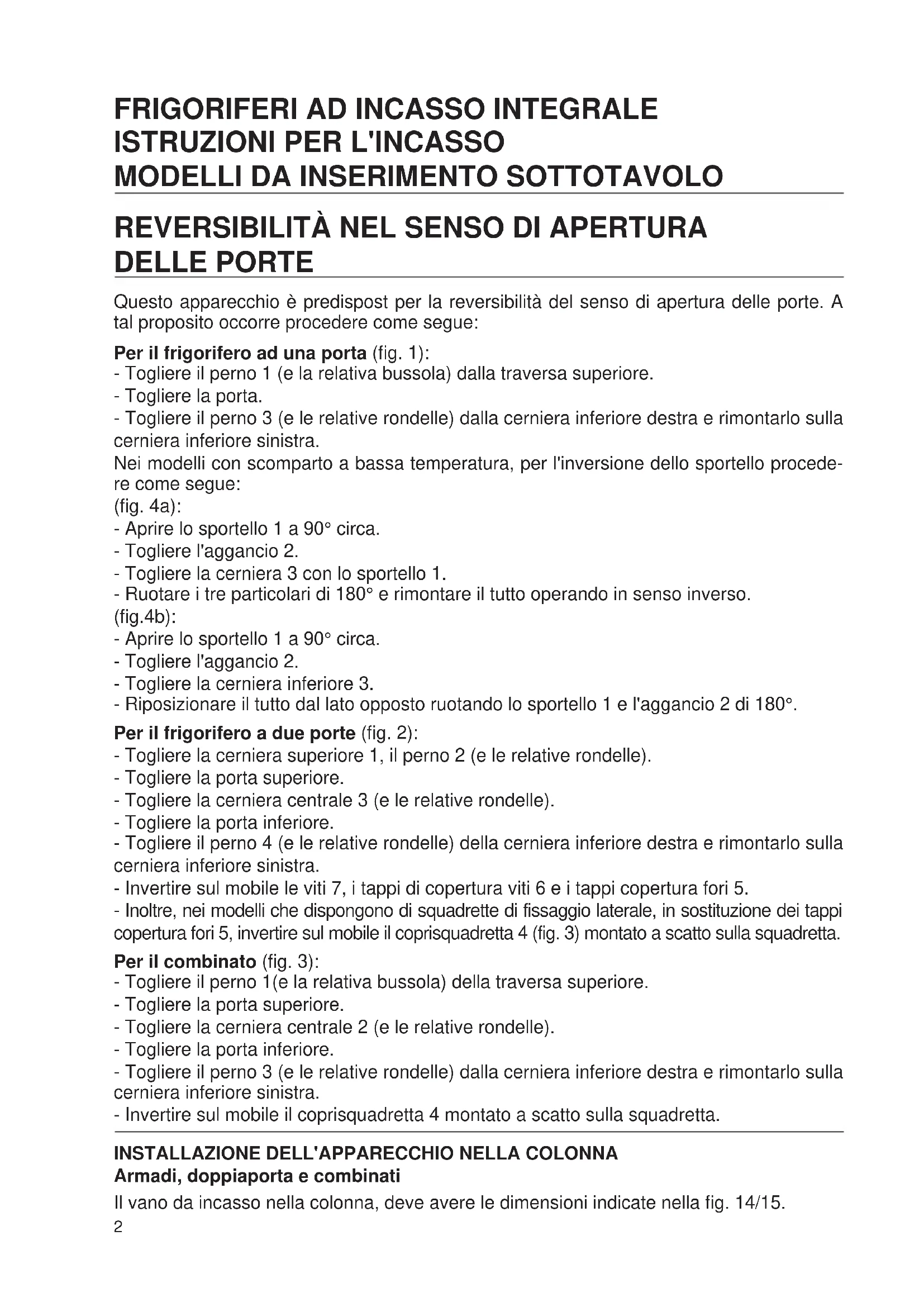 DELLE PORTE Questo apparecchio è predispost per la reversibilità del senso di apertura delle porte. A tal proposito occorre procedere come segue: Per il frigorifero ad una porta (fig. 1): - Togliere il perno 1 (e la relativa bussola) dalla traversa superiore. - Togliere la porta. - Togliere il perno 3 (e le relative rondelle) dalla cerniera inferiore destra e rimontarlo sulla cerniera inferiore sinistra. Nei modelli con scomparto a bassa temperatura, per l'inversione dello sportello procede- re come segue: (fig. 4a): - Aprire lo sportello 1 a 90° circa. - Togliere l'aggancio 2. - Togliere la cerniera 3 con lo sportello 1. - Ruotare i tre particolari di 180° e rimontare il tutto operando in senso inverso. (fig.4b): - Aprire lo sportello 1 a 90° circa. - Togliere l'aggancio 2. - Togliere la cerniera inferiore 3. - Riposizionare il tutto dal lato opposto ruotando lo sportello 1 e l'aggancio 2 di 180°. Per il frigorifero a due porte (fig. 2): - Togliere la cerniera superiore 1, il perno 2 (e le relative rondelle). - Togliere la porta superiore. - Togliere la cerniera centrale 3 (e le relative rondelle). - Togliere la porta inferiore. - Togliere il perno 4 (e le relative rondelle) della cerniera inferiore destra e rimontarlo sulla cerniera inferiore sinistra. - Invertire sul mobile le viti 7, i tappi di copertura viti 6 e i tappi copertura fori 5. - Inoltre, nei modelli che dispongono di squadrette di fissaggio laterale, in sostituzione dei tappi copertura fori 5, invertire sul mobile il coprisquadretta 4 (fig. 3) montato a scatto sulla squadretta. Per il combinato (fig. 3): - Togliere il perno 1(e la relativa bussola) della traversa superiore. - Togliere la porta superiore. - Togliere la cerniera centrale 2 (e le relative rondelle). - Togliere la porta inferiore. - Togliere il perno 3 (e le relative rondelle) dalla cerniera inferiore destra e rimontarlo sulla cerniera inferiore sinistra. - Invertire sul mobile il coprisquadretta 4 montato a scatto sulla squadretta.