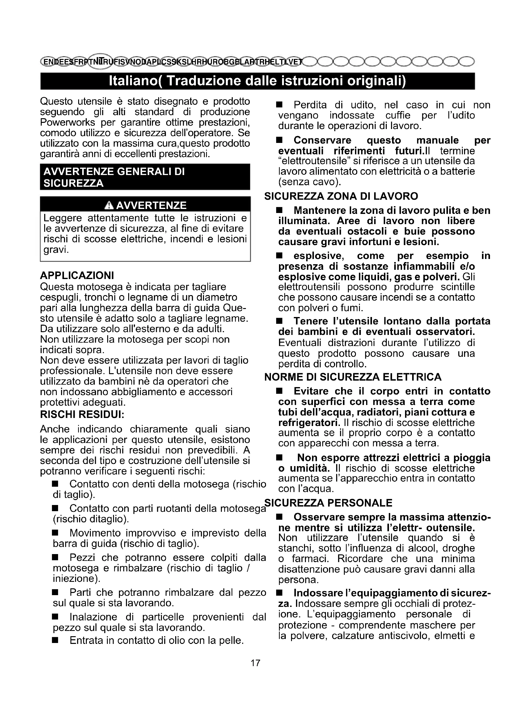EN DE ES FR PT NL RU FI SV NO DA PL CS SK SL HR HU RO BG EL AR TR HE LT LV ET Questo utensile è stato disegnato e prodotto seguendo gli alti standard di produzione Powerworks per garantire ottime prestazioni, comodo utilizzo e sicurezza dell’operatore. Se utilizzato con la massima cura,questo prodotto garantirà anni di eccellenti prestazioni.