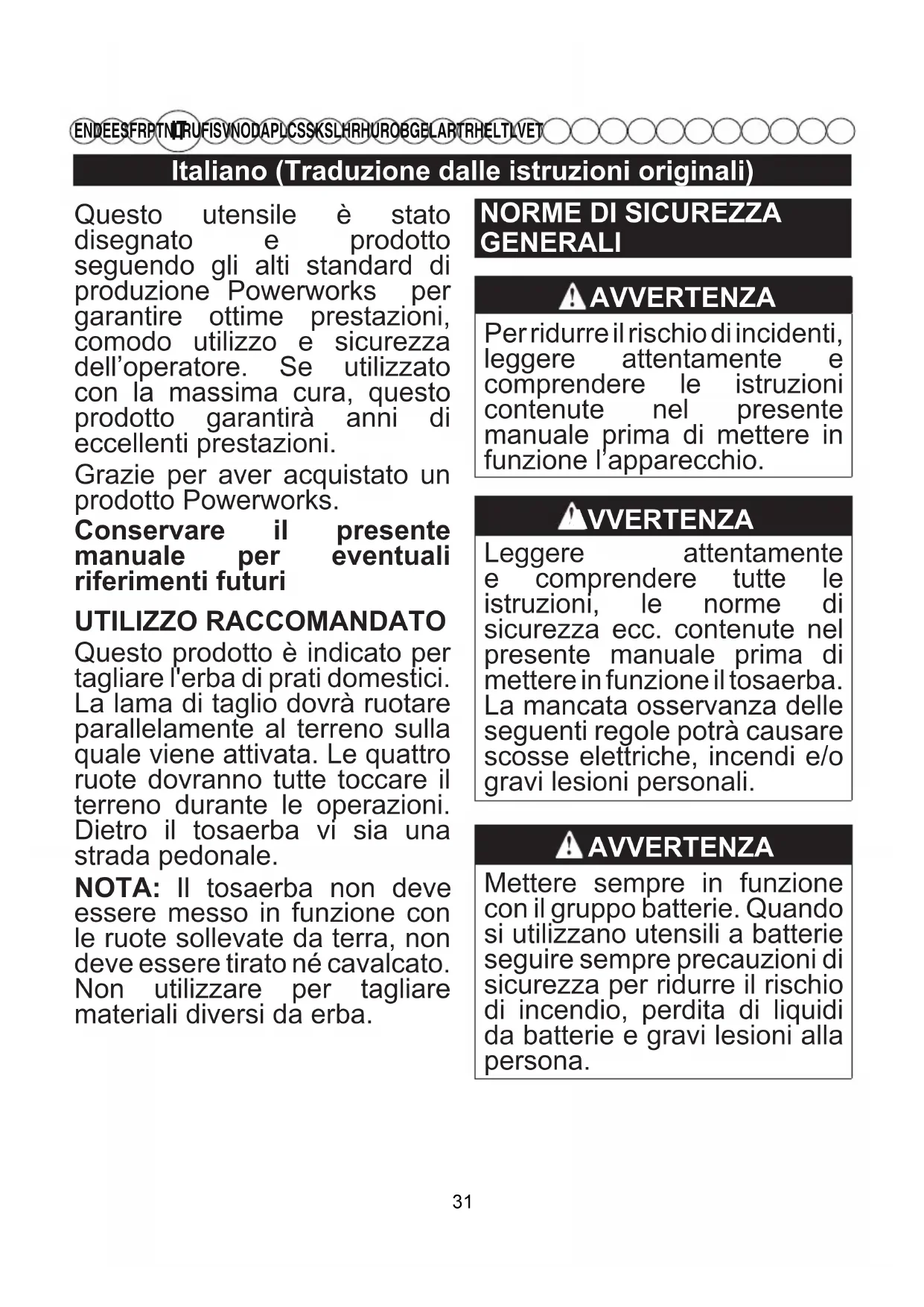 MEDIO AMBIENTE Los productos eléctricos de desperdicio no deben desecharse con desperdicios caseros. Por favor recíclelos donde existan dichas instalaciones. Compruebe con su autoridad local o minorista para reciclar. La recogida selectiva de productos usados y embalajes permite que los materiales se reciclen y vuelvan a utilizarse. La reutilización de los materiales reciclados ayuda a prevenir la contaminación medioambiental y reduce la demanda de materias primas. Al final de su vida útil, tire las baterías con el debido cuidado para nuestro medio ambiente. La batería contiene material que es peligroso para usted y el medio ambiente. Deberá extraerla y desecharla por separado en una instalación que acepte baterías de ión-litio. 30IT EN DE ES FR PT NL RU FI SV NO DA PL CS SK SL HR HU RO BG EL AR TR HE LT LV ET Italiano (Traduzione dalle istruzioni originali) Questo utensile è stato disegnato e prodotto seguendo gli alti standard di produzione Powerworks per garantire ottime prestazioni, comodo utilizzo e sicurezza dell’operatore. Se utilizzato con la massima cura, questo prodotto garantirà anni di eccellenti prestazioni. Grazie per aver acquistato un prodotto Powerworks. Conservare il presente manuale per eventuali riferimenti futuri UTILIZZO RACCOMANDATO Questo prodotto è indicato per tagliare l'erba di prati domestici. La lama di taglio dovrà ruotare parallelamente al terreno sulla quale viene attivata. Le quattro ruote dovranno tutte toccare il terreno durante le operazioni. Dietro il tosaerba vi sia una strada pedonale. NOTA: Il tosaerba non deve essere messo in funzione con le ruote sollevate da terra, non deve essere tirato né cavalcato. Non utilizzare per tagliare materiali diversi da erba.