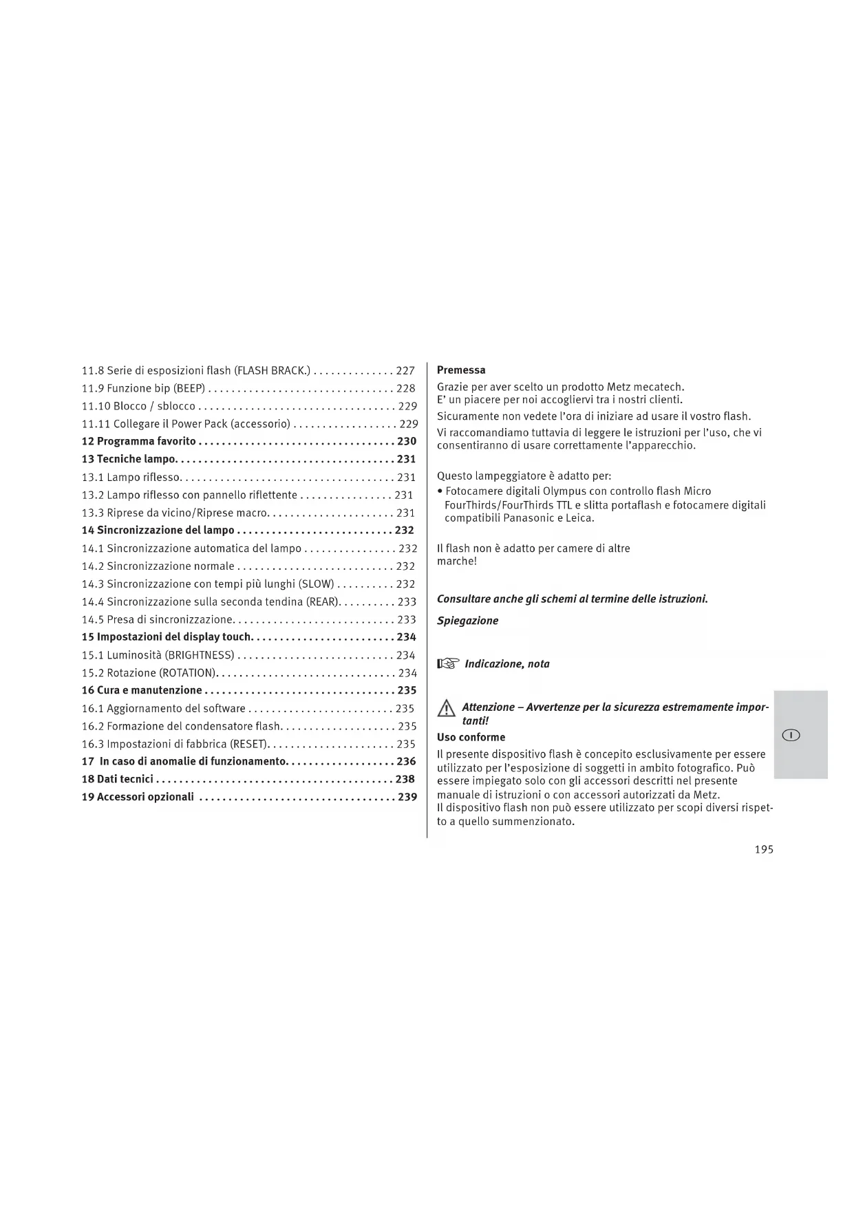 öPremessa Grazie per aver scelto un prodotto Metz mecatech. E’ un piacere per noi accogliervi tra i nostri clienti. Sicuramente non vedete l’ora di iniziare ad usare il vostro flash. Vi raccomandiamo tuttavia di leggere le istruzioni per l’uso, che vi consentiranno di usare correttamente l’apparecchio. Questo lampeggiatore è adatto per: