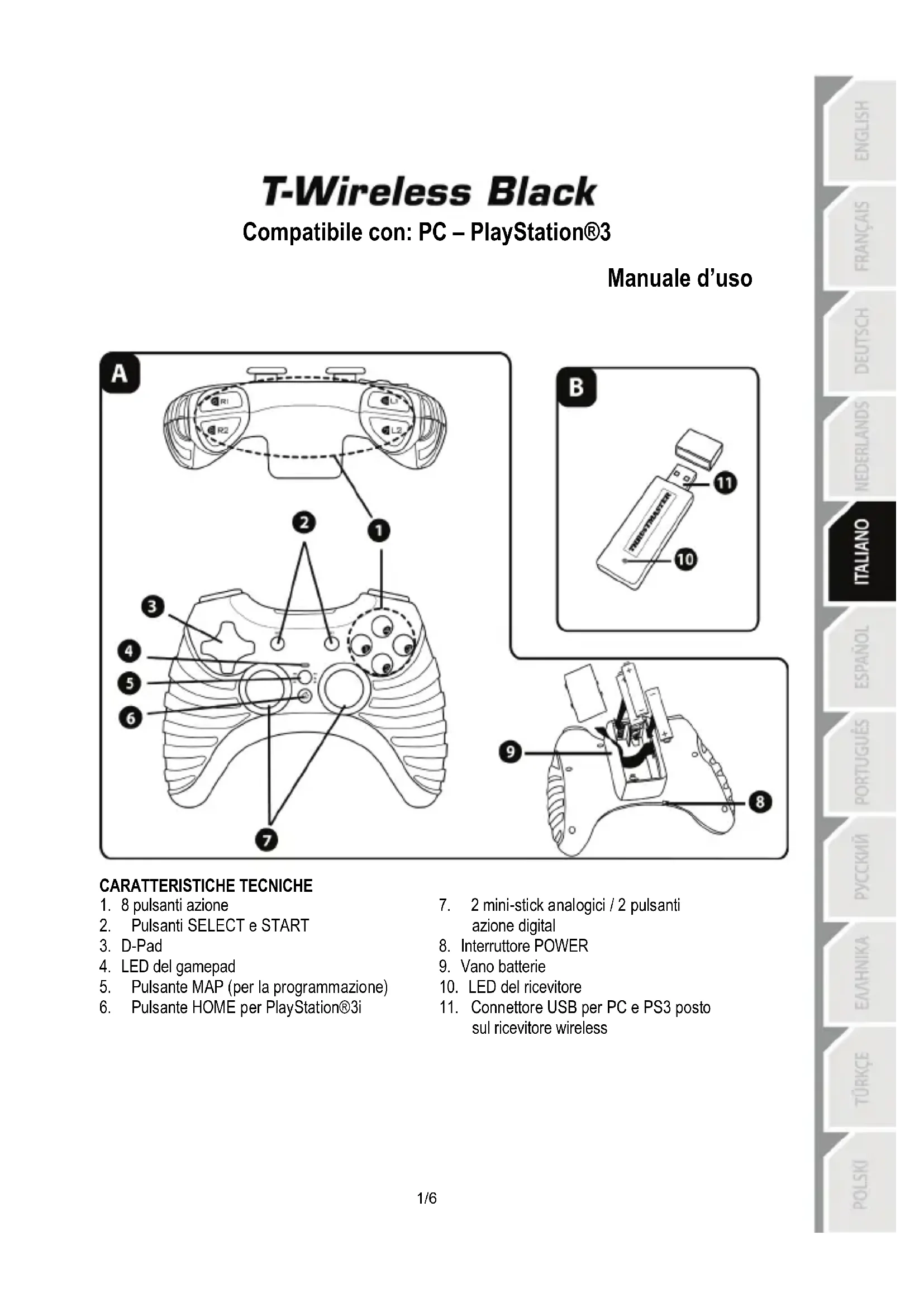 - Non riesco a configurare il mio gamepad: - Nel menu “Opzioni/Controller/Gamepad” del tuo gioco: seleziona la configurazione più appropriata. - Per maggiori informazioni, fai riferimento al manuale d’uso o all’aiuto online del tuo gioco. - Per risolvere questo tipo di problemi, puoi anche utilizzare la funzione di “programmazione” del tuo gamepad. Una volta terminato di utilizzare il tuo gamepad, ti consigliamo di spostare sempre l’interruttore POWER (9) in posizione OFF (aumentando così la durata delle batterie).4/6 Informazioni sulla garanzia al consumatore A livello mondiale, Guillemot Corporation S.A., avente sede legale in Place du Granier, B.P. 97143, 35571 Chantepie, Francia (d’ora in avanti “Guillemot”) garantisce al consumatore che il presente prodotto Thrustmaster sarà privo di difetti relativi ai materiali e alla fabbricazione, per un periodo di garanzia corrispondente al limite temporale stabilito per la presentazione di un reclamo riguardante la conformità del prodotto in questione. Nei paesi della Comunità Europea, tale periodo equivale a due (2) anni a partire dalla consegna del prodotto Thrustmaster. In altri paesi, la durata della garanzia corrisponde al limite temporale stabilito per la presentazione di un reclamo riguardante la conformità del prodotto Thrustmaster in base alle leggi applicabili nel paese in cui il consumatore risiedeva alla data di acquisto del prodotto Thrustmaster (qualora nel paese in questione non esistesse alcuna norma a riguardo, il periodo di garanzia corrisponderà a un (1) anno a partire dalla data originale di acquisto del prodotto Thrustmaster). Qualora, durante il periodo di garanzia, il prodotto dovesse apparire difettoso, contatti immediatamente l’Assistenza Tecnica, che le indicherà la procedura da seguire. Qualora il difetto dovesse essere confermato, il prodotto dovrà essere riportato al luogo di acquisto (o qualsiasi altro luogo indicato dall’Assistenza Tecnica). Nel contesto della presente garanzia, il prodotto difettoso di proprietà del consumatore potrà essere sostituito o reso nuovamente funzionante, a discrezione dell’Assistenza Tecnica. Se, durante il periodo coperto dalla garanzia, il prodotto Thrustmaster fosse oggetto di tale rimessa in operatività, alla rimanente durata della garanzia dovrà essere aggiunto un periodo di almeno sette (7) giorni, durante il quale il prodotto risulta non utilizzabile (tale periodo intercorre dalla data della richiesta di intervento da parte del consumatore o dalla data in cui il prodotto in questione è reso disponibile per la rimessa in operatività, questo nel caso in cui tale data sia successiva alla data di richiesta di intervento). Qualora le leggi applicabili in materia lo consentano, la totale responsabilità di Guillemot e delle sue controllate (compresi i danni conseguenti) si limita alla rimessa in operatività o alla sostituzione del prodotto Thrustmaster. Qualora le leggi applicabili in materia lo consentano, Guillemot declina ogni garanzia sulla commerciabilità o la conformità a finalità particolari. La presente garanzia non potrà essere applicata: (1) se il prodotto è stato modificato, aperto, alterato o ha subito danni derivanti da un uso inappropriato o non autorizzato, da negligenza, da un incidente, dalla semplice usura, o da qualsiasi altra causa non riconducibile a difetti nei materiali o nell'assemblaggio (compresi, ma non i soli, prodotti Thrustmaster combinati con elementi inadatti, tra cui, in particolare, batterie ricaricabili, caricatori o qualsiasi altro elemento non fornito da Guillemot per questo prodotto); (2) nel caso in cui il prodotto sia stato utilizzato per qualsiasi altro scopo al di fuori dell’uso domestico, comprese finalità professionali o commerciali (esempio: sale giochi, allenamenti, concorsi); (3) in caso di mancato rispetto delle istruzioni fornite dall'Assistenza Tecnica; (4) in caso di software, ovvero software soggetto a una specifica garanzia; (5) ai materiali di consumo (elementi che richiedono la loro sostituzione al termine della loro durata di esercizio come, ad esempio, batterie di tipo convenzionale o cuscinetti protettivi per auricolari o cuffie); (6) agli accessori (ad esempio, cavi, custodie, borsette, borse, cinturini); (7) se il prodotto è stato venduto ad un'asta pubblica. La presente garanzia non è trasferibile. I diritti legali del consumatore, stabiliti dalle leggi vigenti in materia di vendita di beni di consumo nel relativo paese, non vengono intaccati dalla presente garanzia.5/6 Disposizioni addizionali sulla garanzia Per tutta la durata della garanzia, in linea di principio, Guillemot non fornirà alcuna parte di ricambio, in quanto la sola Assistenza Tecnica è la parte autorizzata ad aprire e/o rimettere in funzionamento tutti i prodotti Thrustmaster (fatta eccezione per eventuali procedure di rimessa in operatività che l’Assistenza Tecnica potrebbe richiedere al consumatore, attraverso istruzioni scritte – viste, ad esempio, la semplicità e la mancanza di riservatezza della procedura di rimessa in operatività – e fornendo al consumatore le necessarie parti di ricambio, se ve ne fosse l’esigenza). Considerando i propri cicli di innovazione e per proteggere il proprio know-how e i propri segreti commerciali, in linea di principio, Guillemot non fornirà alcuna notifica o parte di ricambio finalizzata alla rimessa in attività di un qualunque prodotto Thrustmaster il cui periodo di garanzia risultasse scaduto. Responsabilità Qualora le leggi applicabili in materia lo consentano, Guillemot Corporation S.A. (d'ora in avanti “Guillemot”) e le sue controllate declinano ogni responsabilità per qualsiasi danno derivante da almeno una delle seguenti condizioni: (1) il prodotto è stato modificato, aperto o alterato; (2) mancato rispetto delle istruzioni di installazione; (3) uso inappropriato o non permesso, negligenza, incidente (come, ad esempio, un impatto); (4) sempl