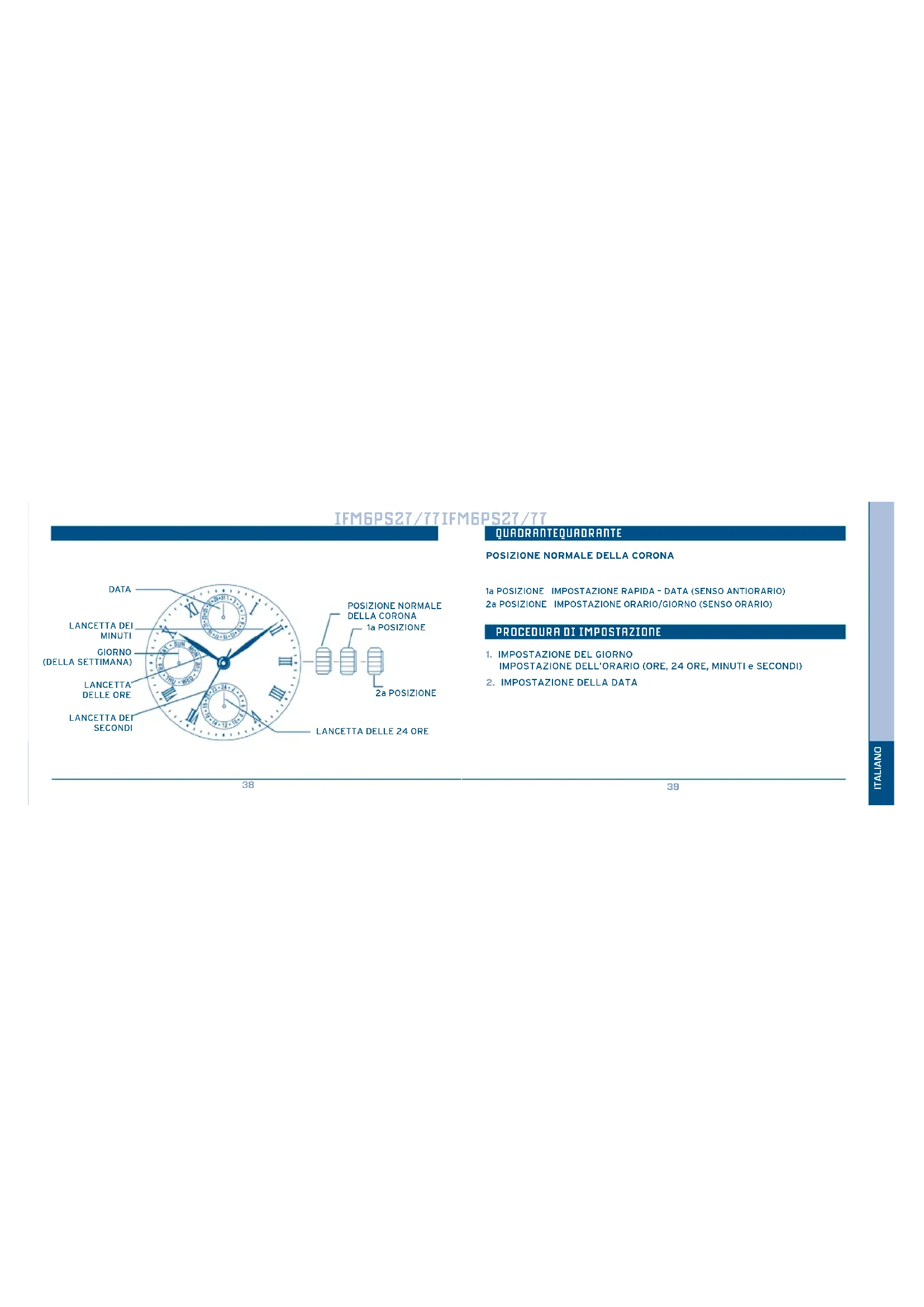 ItalIano IMPOSTAZIONE DEL GIORNO E DELL’ORARIO (ORE, 24 ORE, MINUTI E SECONDI) IMPOSTAZIONE DELLA DATA (IMPOSTAZIONE RAPIDA) Estrarre la corona alla prima posizione. Per impostare rapidamente la data, girare la corona in senso antiorario. NOTA: