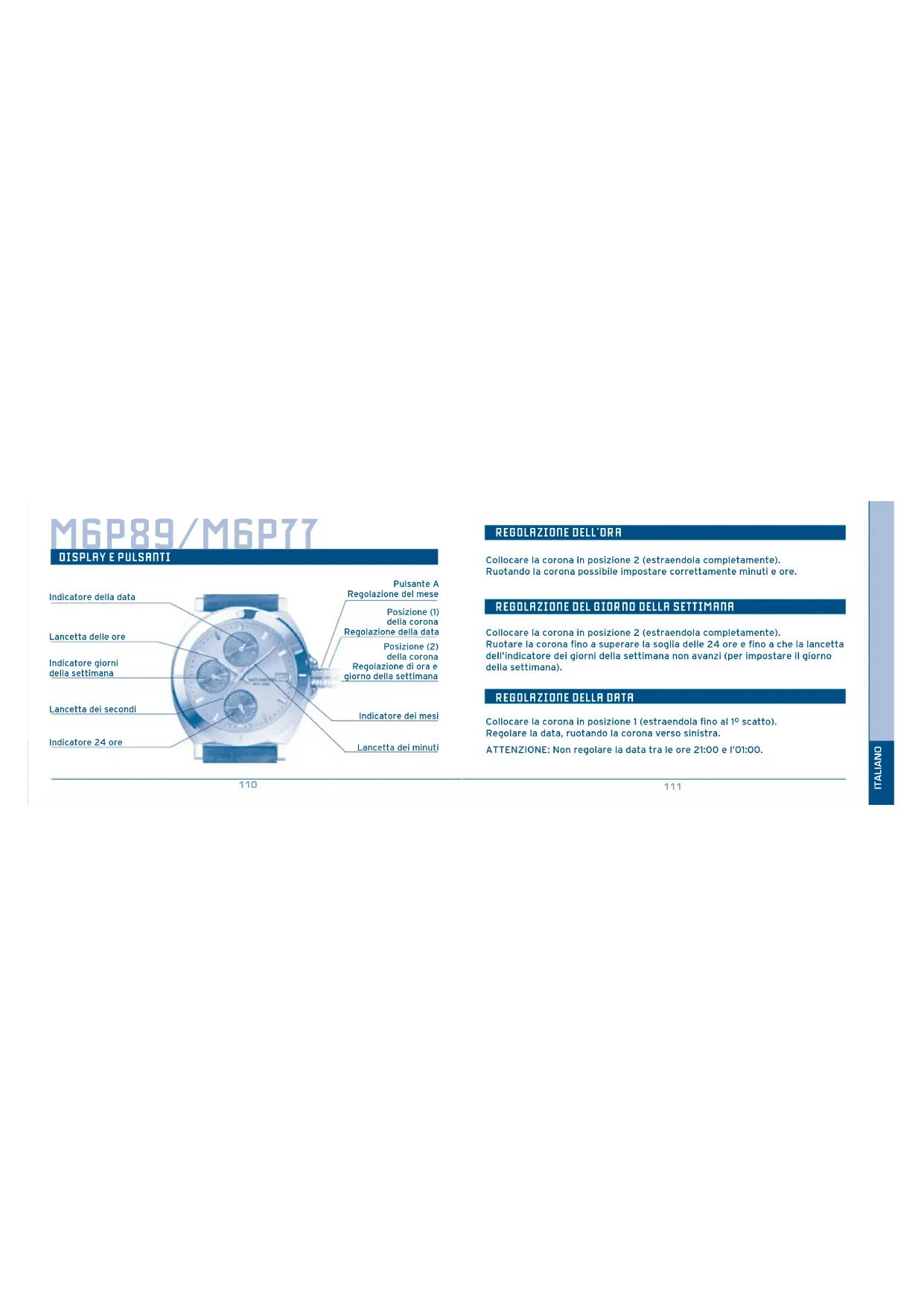 Collocare la corona in posizione 2 (estraendola completamente). Ruotando la corona possibile impostare correttamente minuti e ore. ATTENZIONE: Non regolare la data tra le ore 21:00 e l’01:00. Collocare la corona in posizione 2 (estraendola completamente). Ruotare la corona fino a superare la soglia delle 24 ore e fino a che la lancetta dell’indicatore dei giorni della settimana non avanzi (per impostare il giorno della settimana). Collocare la corona in posizione 1 (estraendola fino al 1º scatto). Regolare la data, ruotando la corona verso sinistra. ATTENZIONE: Non regolare la data tra le ore 21:00 e l’01:00. M6P27 Indicatore della data Lancetta dei minuti Posizione (1) della corona Regolazione della data Posizione (2) della corona Regolazione di ora e giorno della settimana Lancetta delle ore Indicatore giorni della settimana Lancetta dei secondi Indicatore 24 ore114