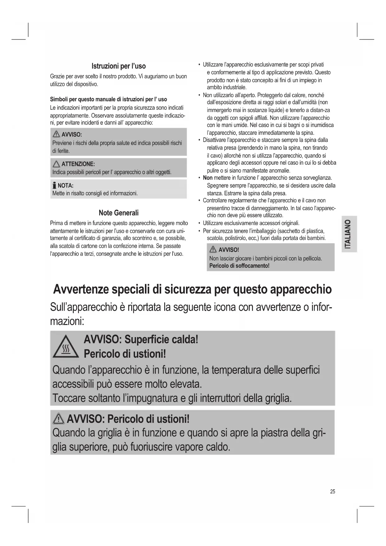 - Per sicurezza tenere l’imballaggio (sacchetto di plastica, scatola, polistirolo, ecc,) fuori dalla portata dei bambini. AVVISO! Non lasciar giocare i bambini piccoli con la pellicola. Pericolo di soffocamento! Istruzioni per l’uso Grazie per aver scelto il nostro prodotto. Vi auguriamo un buon utilizzo del dispositivo. Simboli per questo manuale di istruzioni per l’ uso Le indicazioni importanti per la propria sicurezza sono indicati appropriatamente. Osservare assolutamente queste indicazio- ni, per evitare incidenti e danni all’ apparecchio: AVVISO: Previene i rischi della propria salute ed indica possibili rischi di ferite. ATTENZIONE: Indica possibili pericoli per l’ apparecchio o altri oggetti. NOTA: Mette in risalto consigli ed informazioni. Note Generali Prima di mettere in funzione questo apparecchio, leggere molto attentamente le istruzioni per l’uso e conservarle con cura uni- tamente al certicato di garanzia, allo scontrino e, se possibile, alla scatola di cartone con la confezione interna. Se passate l‘apparecchio a terzi, consegnate anche le istruzioni per l‘uso. Avvertenze speciali di sicurezza per questo apparecchio Sull’apparecchio è riportata la seguente icona con avvertenze o infor- mazioni: AVVISO: Supercie calda! Pericolo di ustioni! Quando l’apparecchio è in funzione, la temperatura delle superci accessibili può essere molto elevata. Toccare soltanto l’impugnatura e gli interruttori della griglia. AVVISO: Pericolo di ustioni! Quando la griglia è in funzione e quando si apre la piastra della gri- glia superiore, può fuoriuscire vapore caldo.26 ATTENZIONE: Pericolo d’incendio! Olio e grasso possono incendiarsi se surriscaldati. Collocare l’ap- parecchio a distanza di sicurezza (30 cm) da materiali inammabili come mobile, tende ecc. ATTENZIONE: Quest’apparecchio non deve essere immerse in acqua per essere pulito. Consultare le istruzioni fornite nel capitolo “Pulizia”.