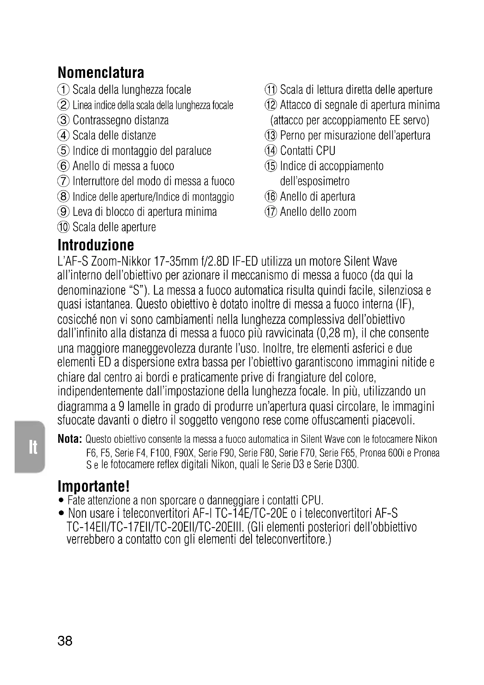 - Non usare i teleconvertitori AF-I TC-14E/TC-20E o i teleconvertitori AF-S TC-14EII/TC-17EII/TC-20EII/TC-20EIII. (Gli elementi posteriori dell’obbiettivo verrebbero a contatto con gli elementi del teleconvertitore.)39