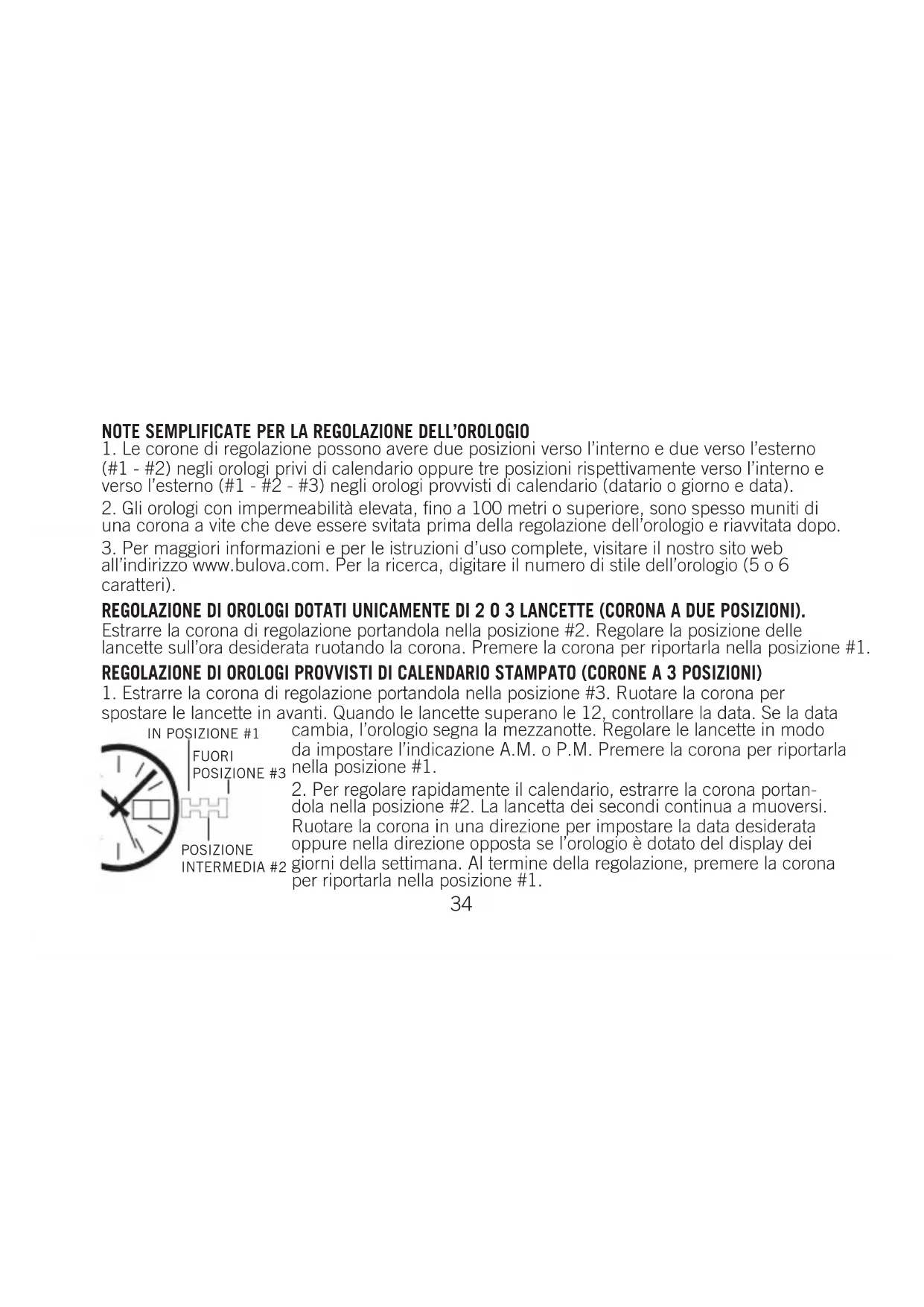 all’indirizzo www.bulova.com. Per la ricerca, digitare il numero di stile dell’orologio (5 o 6 caratteri). REGOLAZIONE DI OROLOGI DOTATI UNICAMENTE DI 2 O 3 LANCETTE (CORONA A DUE POSIZIONI). Estrarre la corona di regolazione portandola nella posizione #2. Regolare la posizione delle lancette sull’ora desiderata ruotando la corona. Premere la corona per riportarla nella posizione #1. REGOLAZIONE DI OROLOGI PROVVISTI DI CALENDARIO STAMPATO (CORONE A 3 POSIZIONI)