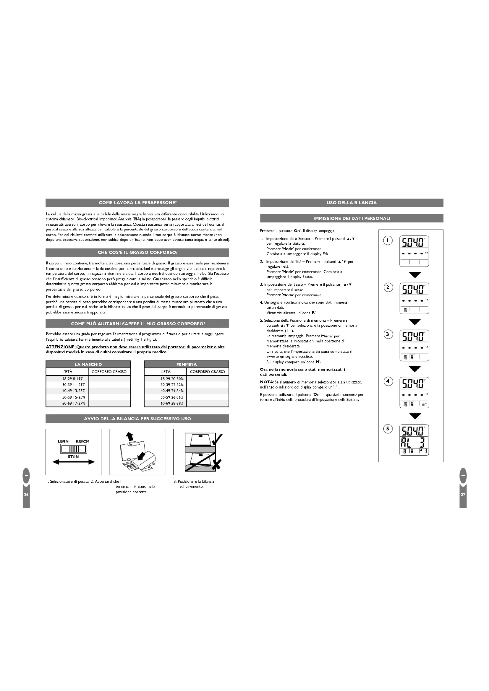 Il corpo umano contiene, tra molte altre cose, una percentuale di grasso. Il grasso è essenziale per mantenere il corpo sano e funzionante – fa da cuscino per le articolazioni e protegge gli organi vitali, aiuta a regolare la temperatura del corpo, immagazzina vitamine e aiuta il corpo a nutrirsi quando scarseggia il cibo. Sia l’eccesso che l’insufficienza di grasso possono però pregiudicare la salute. Guardando nello specchio è difficile determinare quanto grasso corporeo abbiamo per cui è importante poter misurare e monitorare la percentuale del grasso corporeo. Per determinare quanto si è in forma è meglio misurare la percentuale del grasso corporeo che il peso, perché una perdita di peso potrebbe corrispondere a una perdita di massa muscolare piuttosto che a una perdita di grasso, per cui, anche se la bilancia indica che il peso del corpo è normale, la percentuale di grasso potrebbe essere ancora troppo alta. CHE COS’È IL GRASSO CORPOREO? Potrebbe essere una guida per regolare l’alimentazione, il programma di fitness o per aiutarti a raggiungere l’equilibrio salutare. Fai riferimento alle tabelle ( vedi Fig 1 e Fig 2). ATTENZIONE: Questo prodotto non deve essere utilizzato dai portatori di pacemaker o altri dispositivi medici. In caso di dubbi consultare il proprio medico. COME PUÒ AIUTARMI SAPERE IL MIO GRASSO CORPOREO? 1. Selezionatore di pesata. 2. Accertarsi che i terminali +/- siano nella posizione corretta.3. Posizionare la bilancia sul pavimento.
