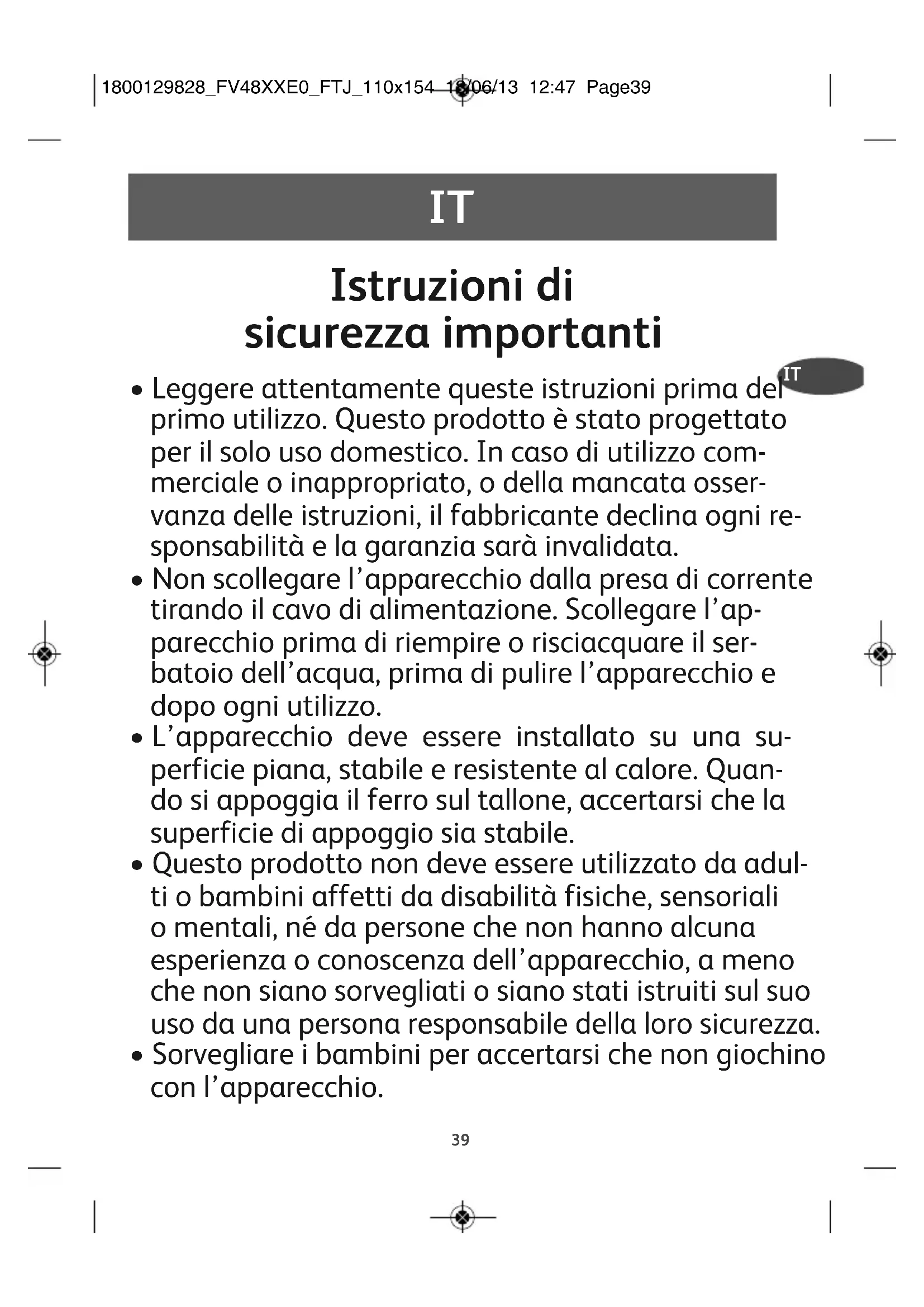 Non utilizzare il ferro se il cavo e8 danneggiato. Contattate il servizio clienti TEFAL o un professionista per la sostituzione.