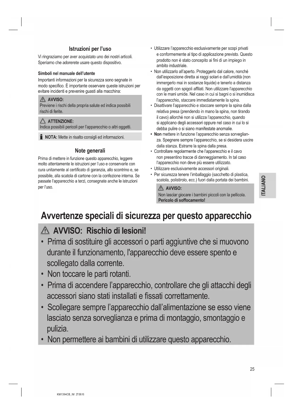 - Non permettere ai bambini di utilizzare questo apparecchio.26 KM1394CB_IM 27.09.16 AVVISO: Rischio di lesioni!