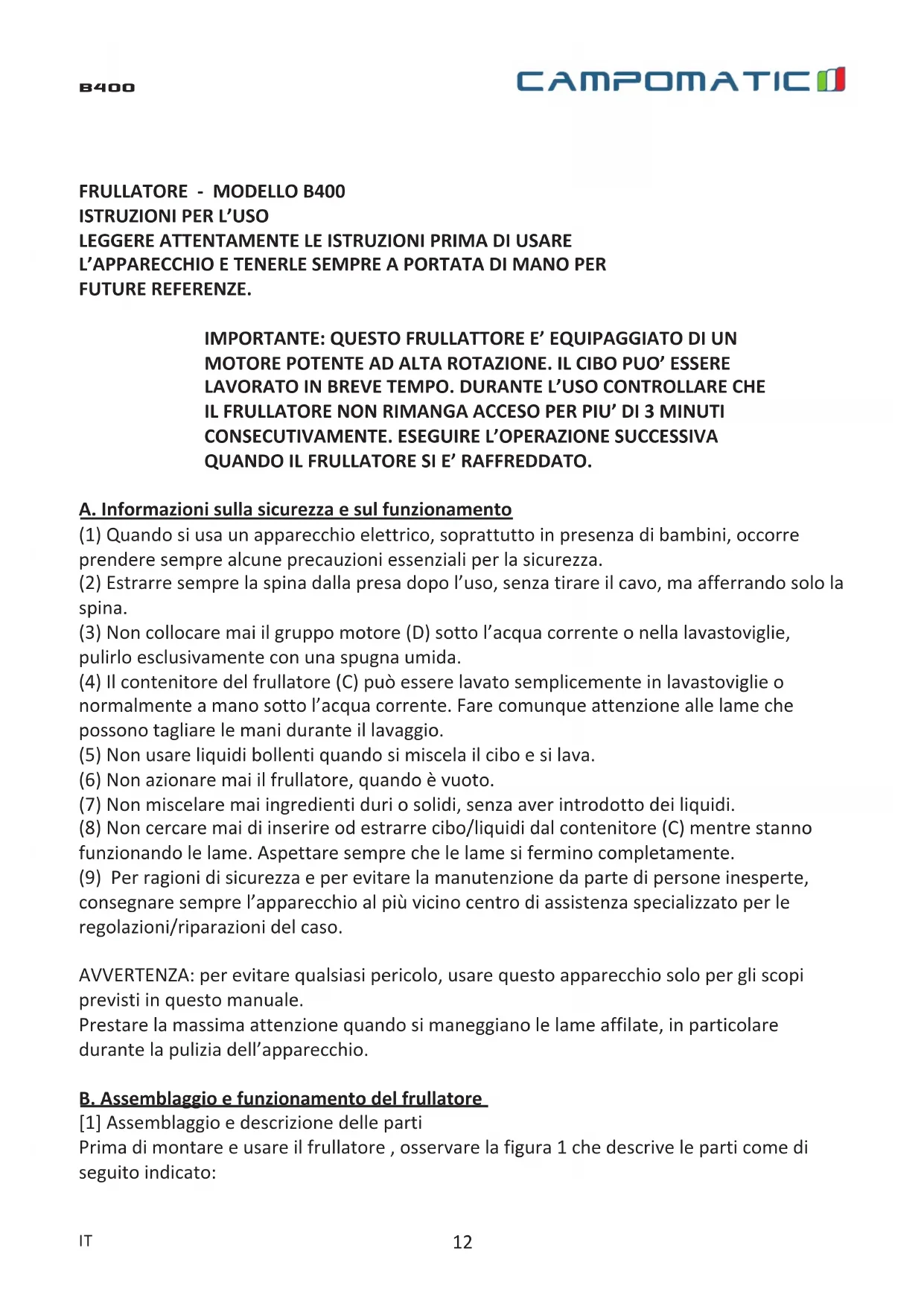 B400 - Frullatore Campomatic - Manuale utente e istruzioni gratuiti