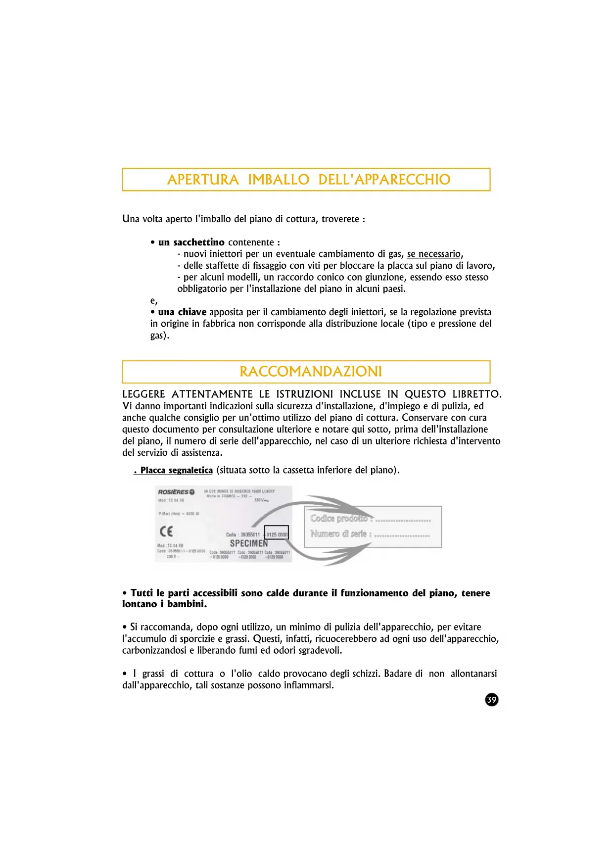 una chiave apposita per il cambiamento degli iniettori, se la regolazione prevista in origine in fabbrica non corrisponde alla distribuzione locale (tipo e pressione del gas). LEGGERE ATTENTAMENTE LE ISTRUZIONI INCLUSE IN QUESTO LIBRETTO. Vi danno importanti indicazioni sulla sicurezza d'installazione, d'impiego e di pulizia, ed anche qualche consiglio per un'ottimo utilizzo del piano di cottura. Conservare con cura questo documento per consultazione ulteriore e notare qui sotto, prima dell'installazione del piano, il numero di serie dell'apparecchio, nel caso di un ulteriore richiesta d'intervento del servizio di assistenza. . Placca segnaletica (situata sotto la cassetta inferiore del piano). Tutti le parti accessibili sono calde durante il funzionamento del piano, tenere lontano i bambini. Si raccomanda, dopo ogni utilizzo, un minimo di pulizia dell'apparecchio, per evitare l'accumulo di sporcizie e grassi. Questi, infatti, ricuocerebbero ad ogni uso dell'apparecchio, carbonizzandosi e liberando fumi ed odori sgradevoli. I grassi di cottura o l'olio caldo provocano degli schizzi. Badare di non allontanarsi dall'apparecchio, tali sostanze possono infiammarsi. RACCOMANDAZIONI40 PIANO DI COTTURA :