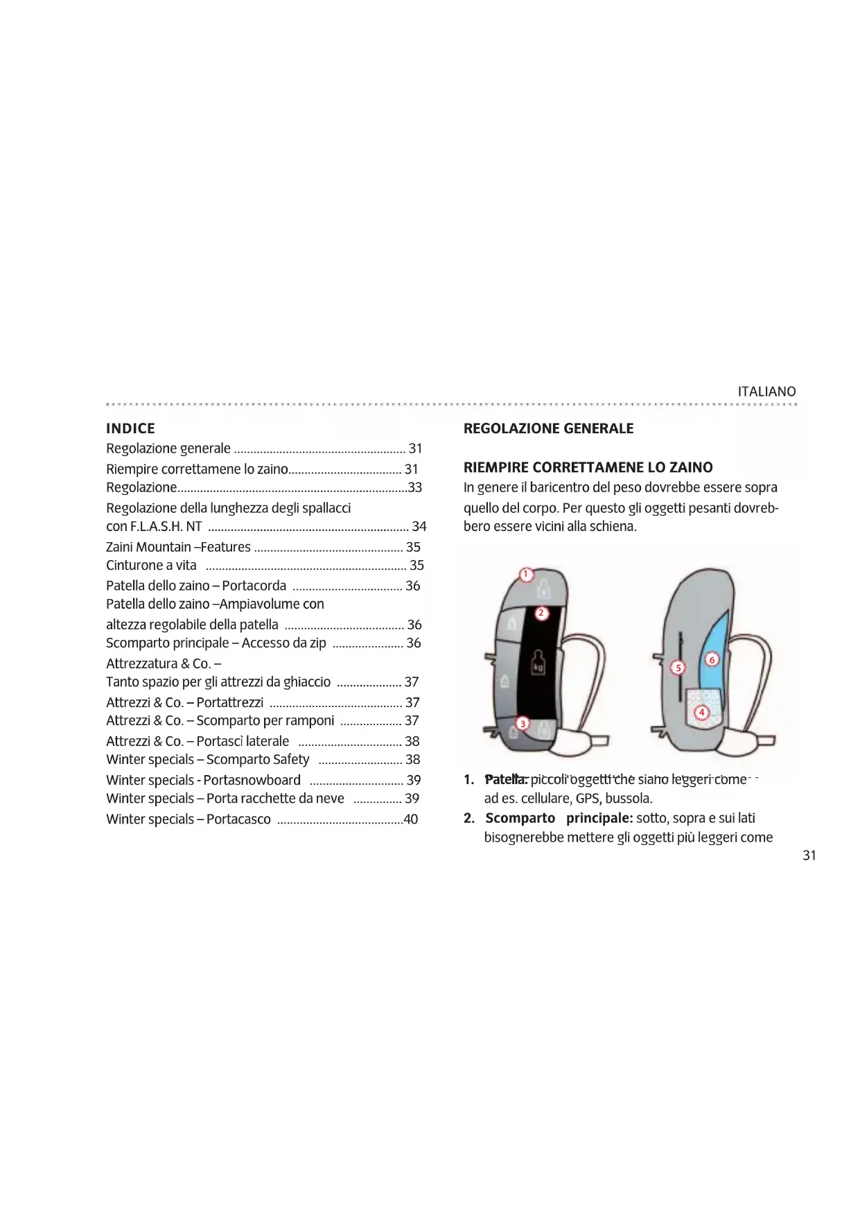 vicino alla schiena per non infl uenzare negativa- mente il baricentro del corpo. Negli zaini con patel- la, il foro del tubicino d’idratazione è al lato, sotto l’apertura della patella. Negli zaini con zip è sopra le bretelle del sacco. Uscita tubicino d’idratazione. Apertura con zip Fissaggio della sacca: con gancio Fissaggio della sacca: a velcro Uscita tubicino d’idratazione. Apertura della patella33 ITALIANO REGOLAZIONE Per regolare lo zaino caricato procedere come segue: