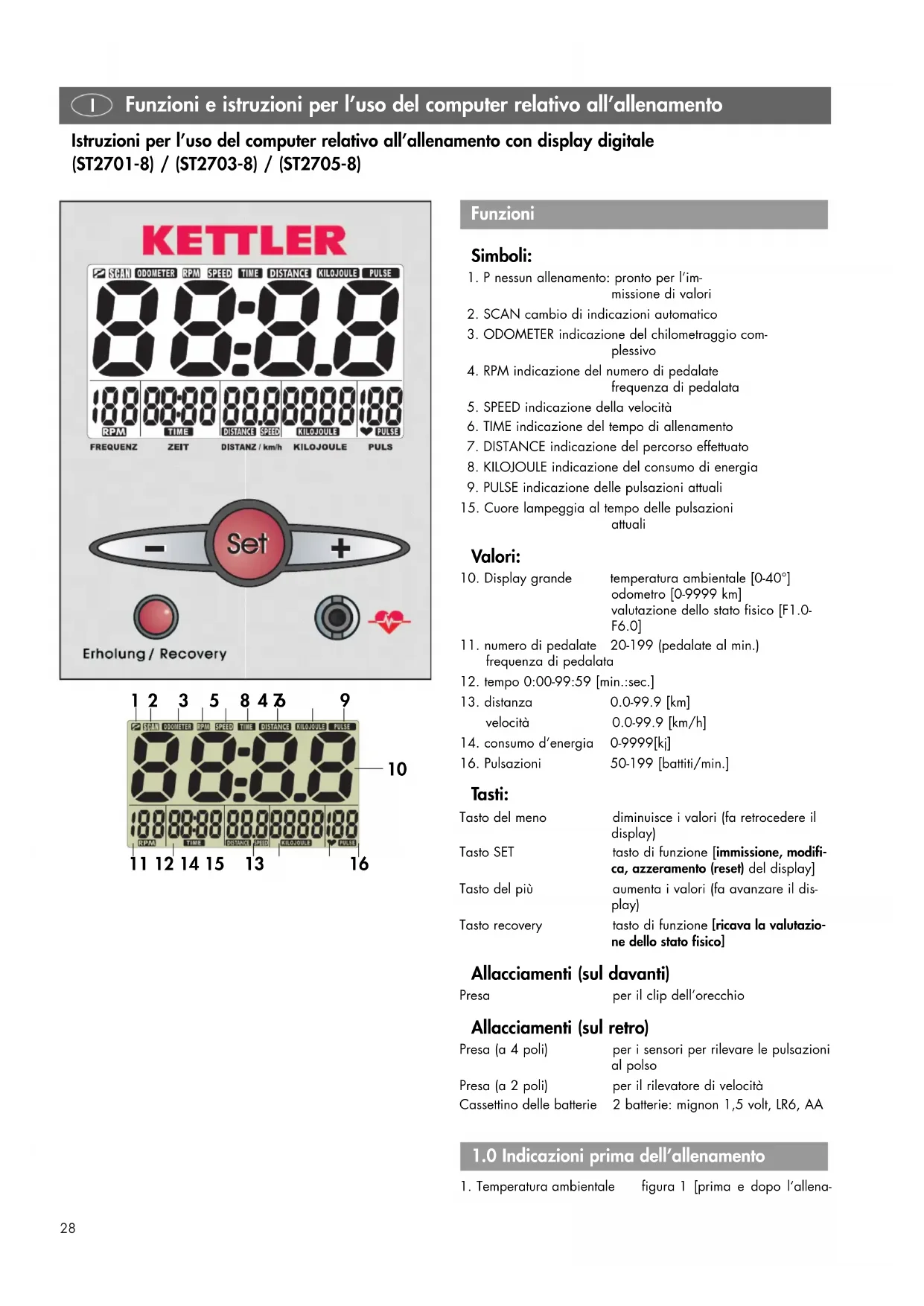 Tasti: Tasto del meno diminuisce i valori (fa retrocedere il display) Tasto SET tasto di funzione [immissione, modifi- ca, azzeramento (reset) del display] Tasto del più aumenta i valori (fa avanzare il dis- play) Tasto recovery tasto di funzione [ricava la valutazio- ne dello stato fisico] Allacciamenti (sul davanti) Presa per il clip dell’orecchio Allacciamenti (sul retro) Presa (a 4 poli) per i sensori per rilevare le pulsazioni al polso Presa (a 2 poli) per il rilevatore di velocità Cassettino delle batterie 2 batterie: mignon 1,5 volt, LR6, AA