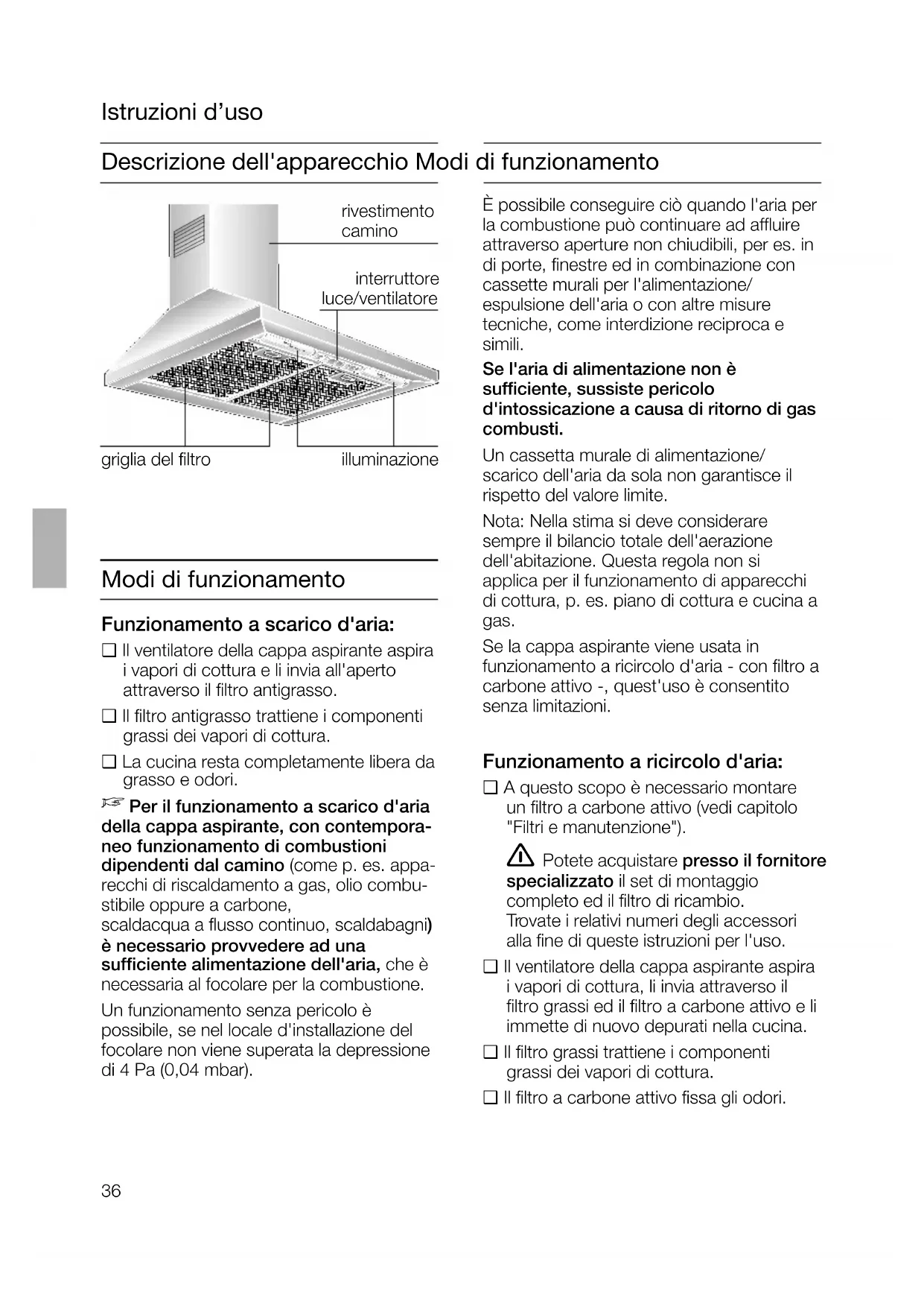 Per il funzionamento a scarico d'aria della cappa aspirante, con contempora- neo funzionamento di combustioni dipendenti dal camino (come p. es. apparecchi di riscaldamento a gas, olio combustibile oppure a carbone, scaldacqua a flusso continuo, scaldabagni) è necessario provvedere ad una sufficiente alimentazione dell'aria, che è necessaria al focolare per la combustione. Un funzionamento senza pericolo è possibile, se nel locale d'installazione del focolare non viene superata la depressione di 4 Pa (0,04 mbar). È possibile conseguire ciò quando l'aria per la combustione può continuare ad affluire attraverso aperture non chiudibili, per es. in di porte, finestre ed in combinazione con cassette murali per l'alimentazione/ espulsione dell'aria o con altre misure tecniche, come interdizione reciproca e simili. Se l'aria di alimentazione non è sufficiente, sussiste pericolo d'intossicazione a causa di ritorno di gas combusti. Un cassetta murale di alimentazione/ scarico dell'aria da sola non garantisce il rispetto del valore limite. Nota: Nella stima si deve considerare sempre il bilancio totale dell'aerazione dell'abitazione. Questa regola non si applica per il funzionamento di apparecchi di cottura, p. es. piano di cottura e cucina a gas. Se la cappa aspirante viene usata in funzionamento a ricircolo d'aria – con filtro a carbone attivo –, quest'uso è consentito senza limitazioni.